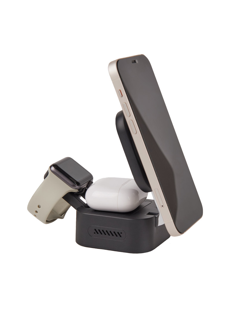 Эта зарядка 3 в 1 идеально подходит для повседневного использования. Она не только функциональна, но и эстетична — современный дизайн станет украшением любого стола. Благодаря компактной конструкции и встроенному кабелю, она легко помещается в сумку или рюкзак, поэтому её удобно брать в поездку или командировку.