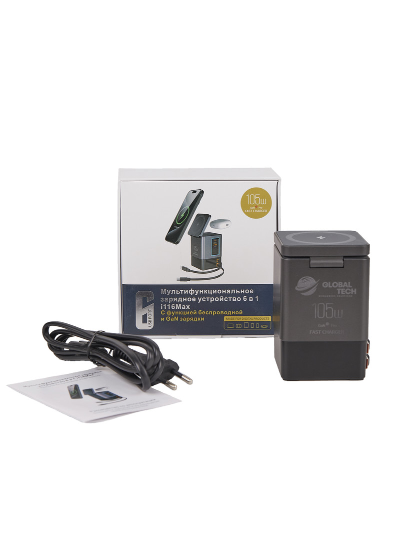 i116 Max — это компактная и технологичная зарядная станция нового поколения, созданная для тех, кто ценит комфорт, порядок и эффективность. Устройство сочетает в себе сразу шесть видов зарядки, включая беспроводную, проводную, зарядку для смарт-часов и наушников. Мощность до 105 Вт позволяет заряжать не только смартфоны, но и планшеты, ноутбуки и другие устройства — одновременно и быстро.