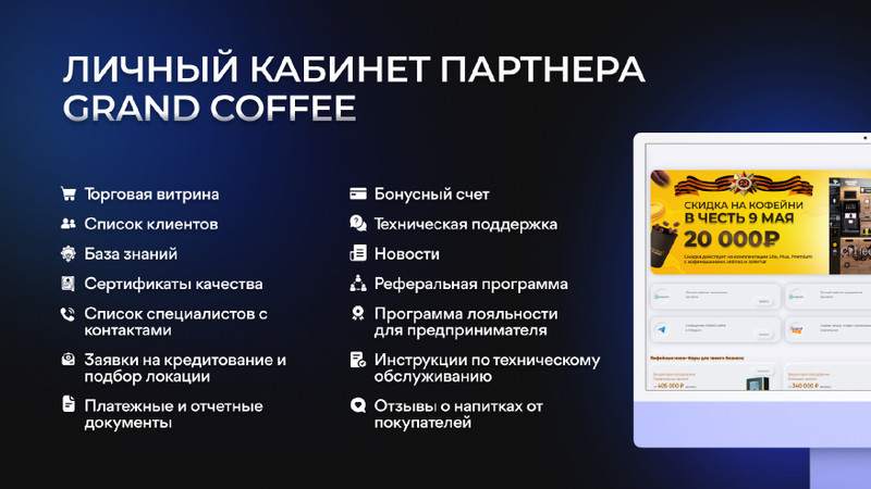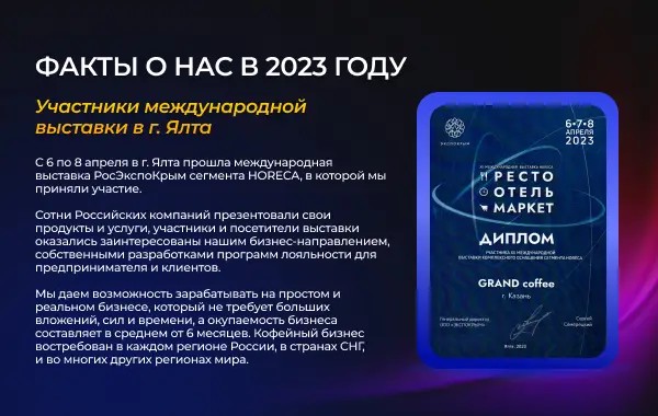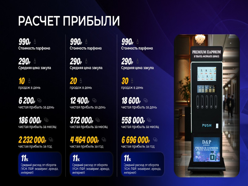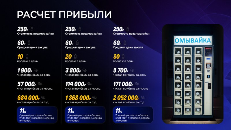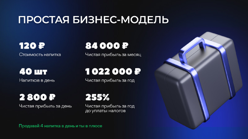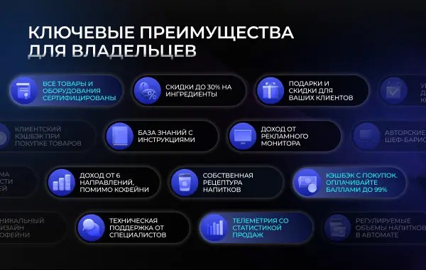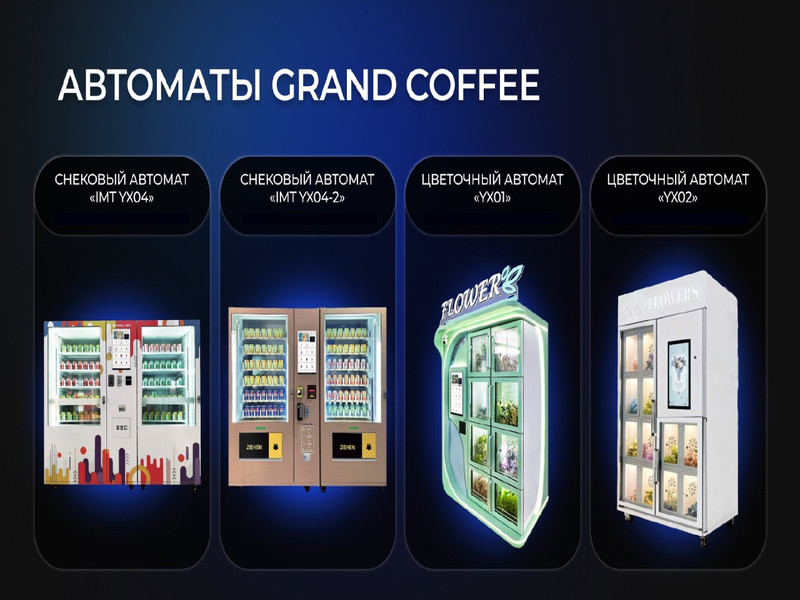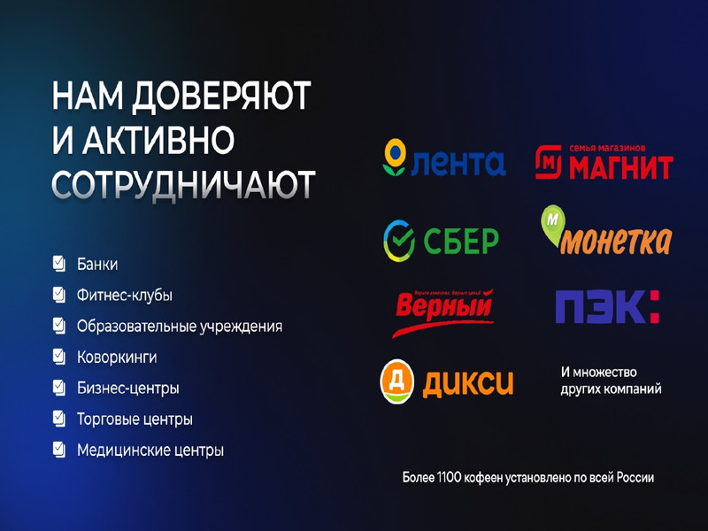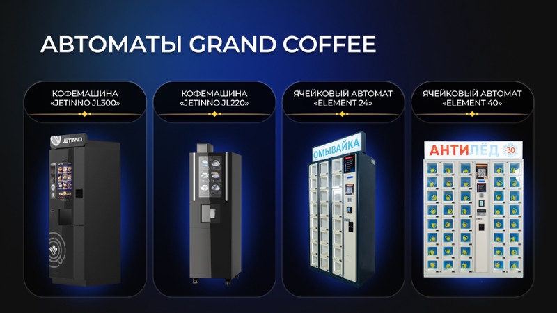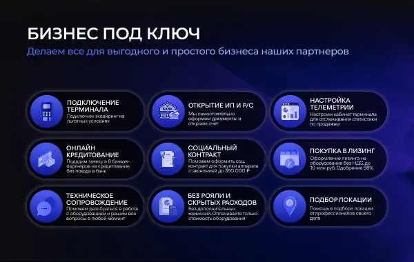 Каждый аппарат поставляется с уже настроенными рецептурами и стартовым набором товаров.