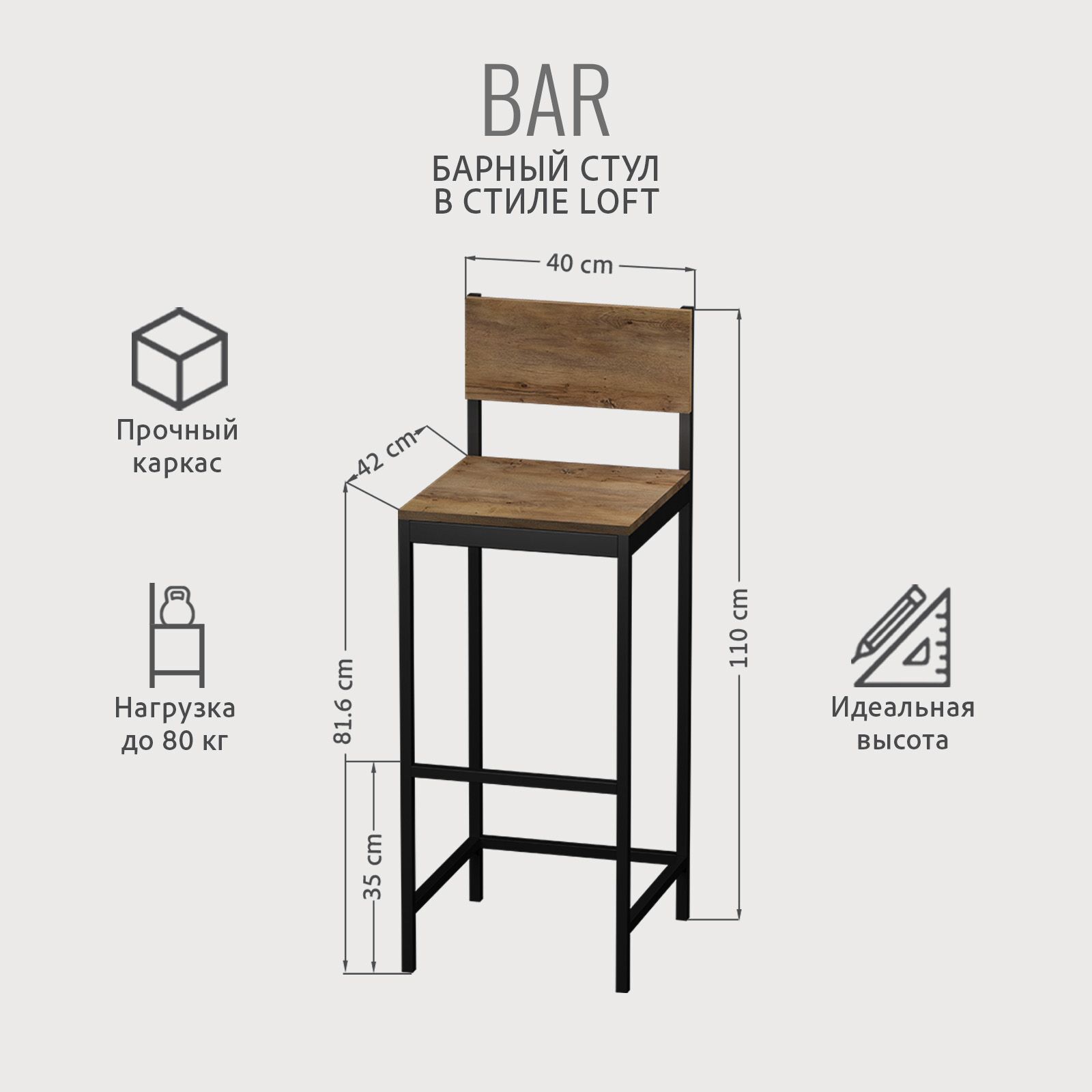 Прочная и устойчивая конструкция стула для барной стойки, усиленная перекладинами, выдерживает нагрузку до 80 кг. Пластиковые заглушки на ножках обеспечивают шумоизоляцию и сохранность напольного покрытия при использовании.