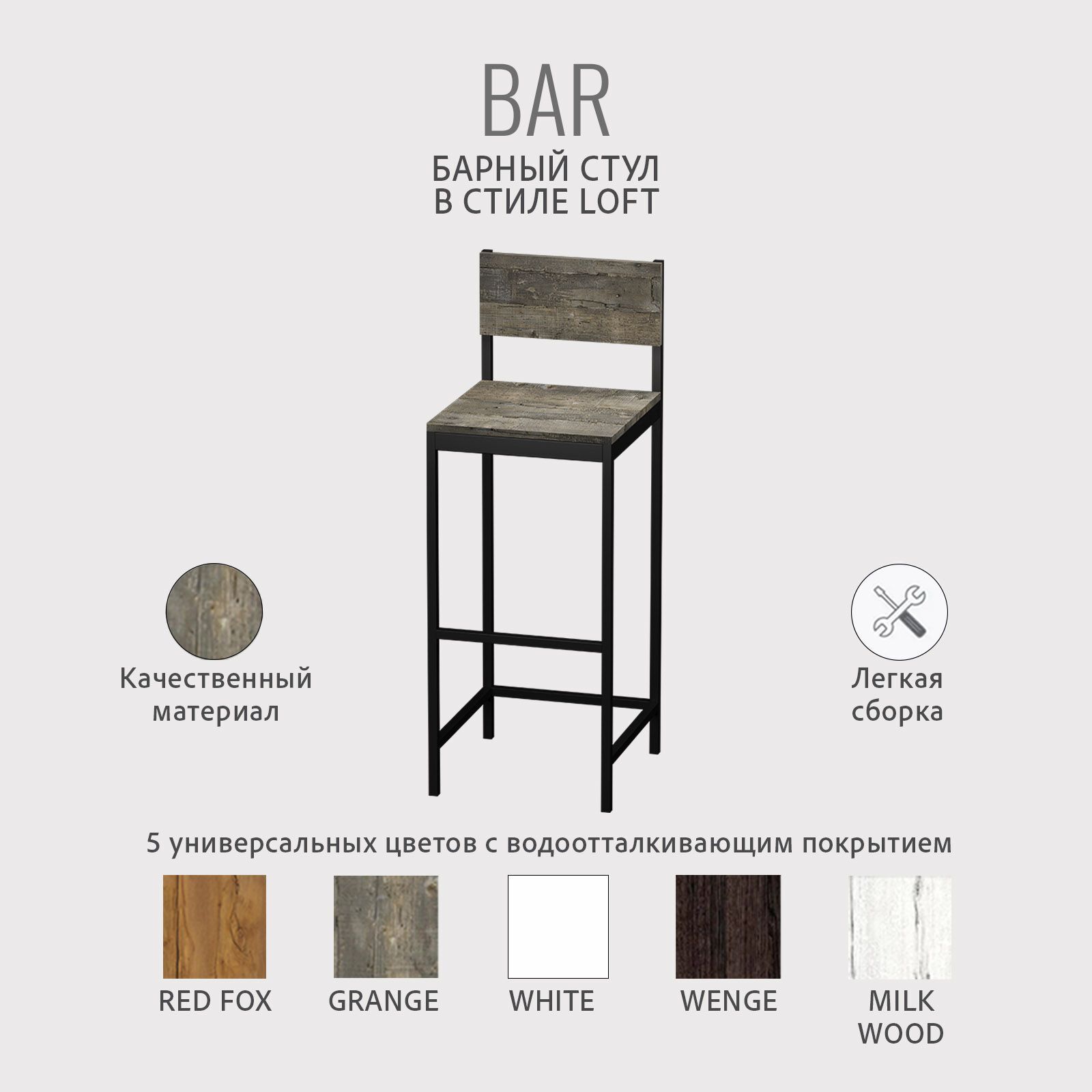 Стул барный лофт доставляется в разобранном виде в 1 упаковке, комплект крепежа входит в комплектацию.Легкая и быстрая сборка.