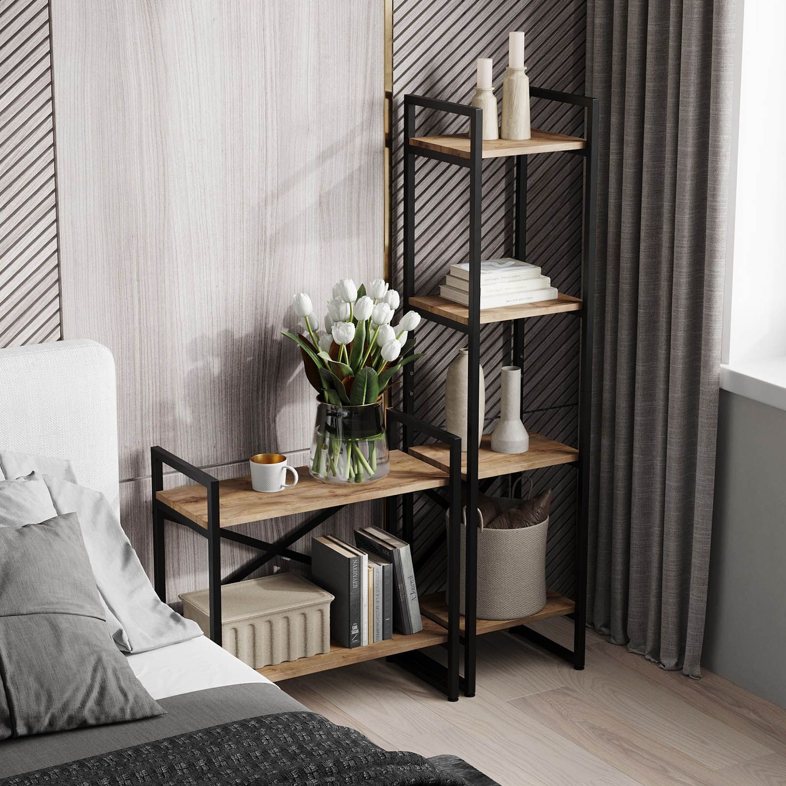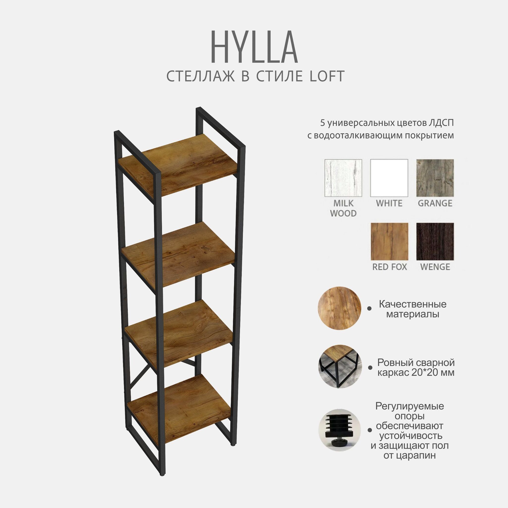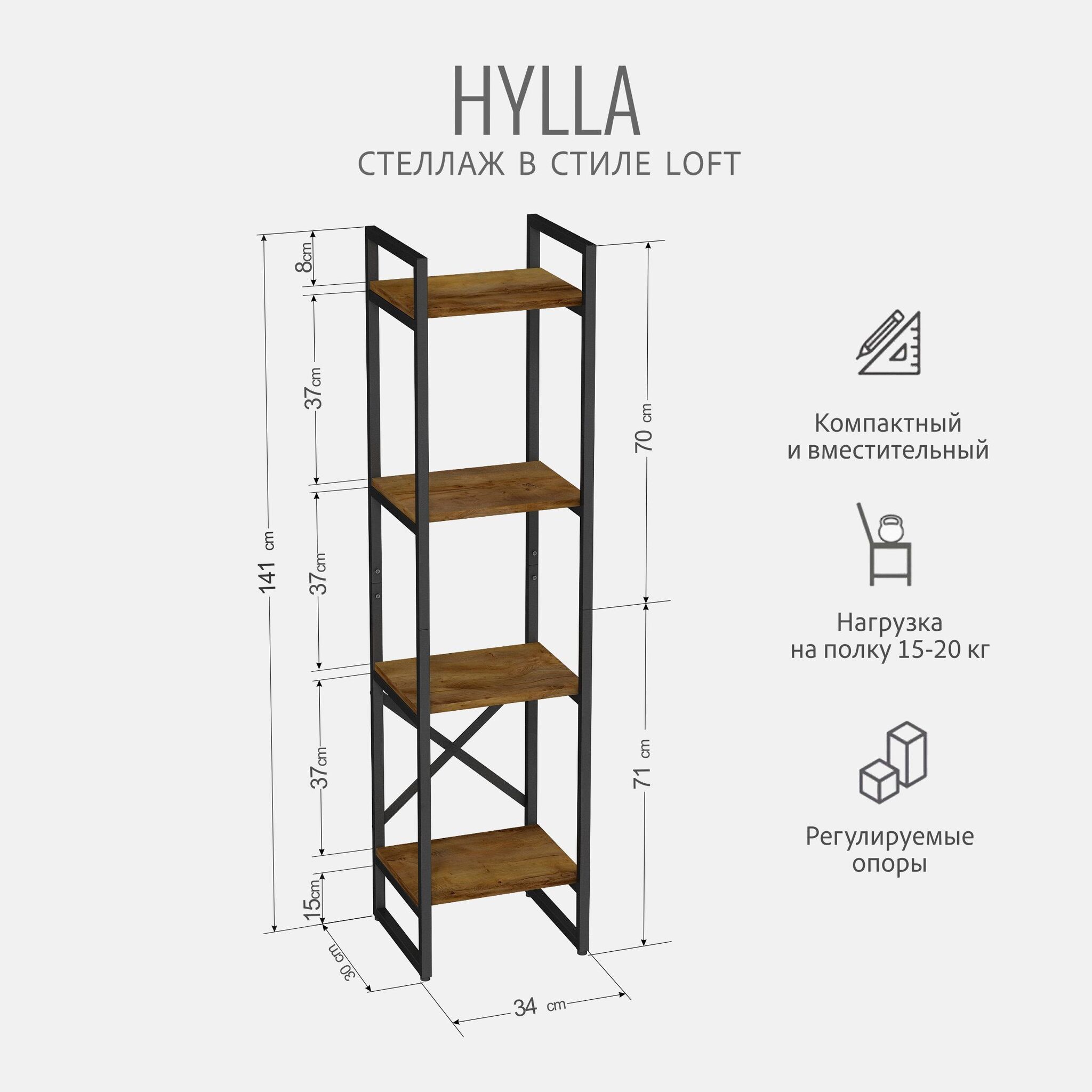 Модульный металлический стеллаж HYLLA mini- универсальное решение для хранения вещей в любом помещении. Современный дизайн стеллажа в стиле лофт отлично впишется в интерьер квартиры, прихожей, дачного дома, гаража, балкона, офиса, склада или магазина. Высокий, узкий напольный стеллаж идеально подойдет для зонирования комнаты, тем самым поможет организовать пространство и создать уютную атмосферу. Этот стеллаж - отличный выбор для людей, которые хотят организовать свои вещи и красиво оформить интерьер комнаты. Он прочный, надежный и практичный, а также является экологически чистой альтернативой икеевской мебели. Получите множество возможностей для хранения вещей с металлическим стеллажем! Используйте шкаф стеллаж как офисная мебель, книжный стеллаж, стеллаж для рассады и цветов, стеллаж в ванную комнату, стеллаж для кухни, стеллаж на балкон, витрина стеллаж, стеллаж для посуды, стеллаж в гостиную, гардеробная система. Если вам нужно разместить инструменты и принадлежности, то металлическая этажерка станет незаменимой в гараже или мастерской. Шкаф стеллаж идеально подойдет для хранения книг и документов в книжной комнате или гостиной. Вместительные широкие полки подойдут, как мебель для хранения инструментов и ящиков, садовых принадлежностей, банок с заготовками, инвентаря и стройматериалов. Компактный и открытый железный стеллаж будет выигрышно смотреться в кладовке, прачечной, в пункте выдачи заказов. Наш стеллаж отлично справится с ролью оригинальной кухонной мебели. Он подходит для хранения кухонных принадлежностей, посуды и других необходимых мелочей. Стеллаж поможет вам освободить пространство на столеМеталлический каркас у стеллажа с полками выполнен из квадратной профильной трубы 20х20мм, окрашен в черный матовый цвет и защищен от ржавчины и коррозии благодаря порошковому покрытию, устойчивому к влаге. Полки изготовлены из высококачественного ЛДСП толщиной 16мм, каждая полочка выдерживает нагрузку до 20 кг. Стеллаж модульный изготовлен из цельносварного металлического каркаса, усилен двумя задними металлическими балками, что позволяет ему сохранять устойчивое положение. На ножках имеются регулируемые опоры, которые регулируются по высоте и позволяют защитить пол от царапин и вмятин. Размеры этажерки стеллажа в собранном виде: высота - 103,5см, ширина - 34см, глубина - 30см.Поставляется стеллаж деревянный в 1 упаковке, конструкция разборная, легко собирается с помощью шуруповерта и болтов, крепления и инструкция по сборке входят в комплектацию. Качественную и удобную мебель для хранения своих вещей вы можете приобрести в нашем магазине.Товар продается напрямую от производителя, что гарантирует качество и выгодную цену.