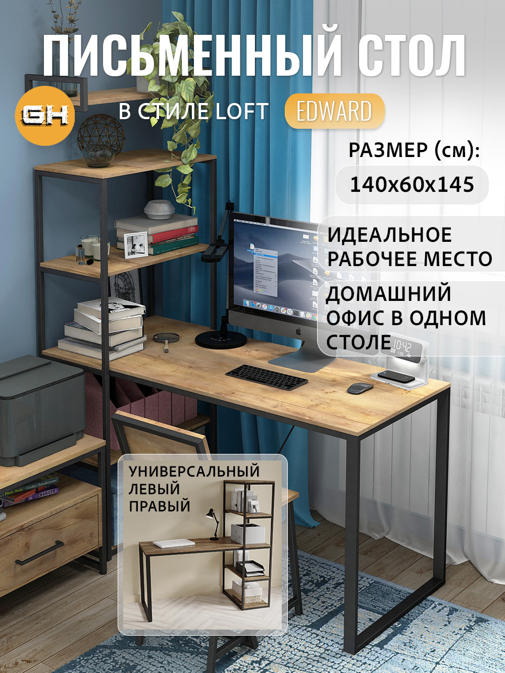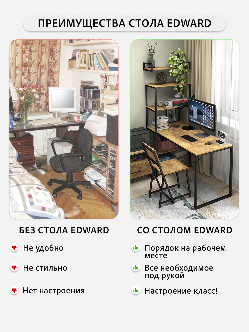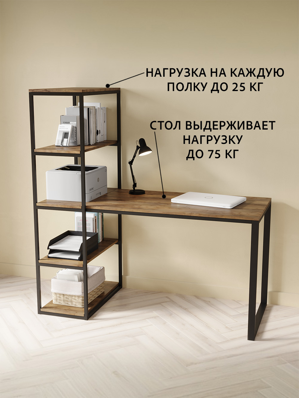 Письменный стол Edward изготовлен в стиле LOFT. Классическая модель компьютерного стола сочетает в себе оригинальный дизайн, практичность и качество. Стол идеально подойдет для работы и учебы, как письменный стол для школьника, парта для школьника, стол офисный, модуль для ресепшена и для организации домашнего рабочего пространства. Универсальная конструкция компьютерного стола позволяет менять расположение стеллажа на левую и на правую сторону.Стол компьютерный Эдвард комбинированный с открытой стеллажной системой, позволяет создать удобное, эргономичное и функциональное рабочее место на минимальной площади. Стеллаж можно заполнить книгами, учебниками, компьютерными принадлежностями, сувенирами, папками с документами.Металлическая конструкция выполнена из профильной трубы 40х20 мм и 20х20 мм, что позволяет выдерживать нагрузку 180 кг, стол так же усилен траверсой под самой столешницей для дополнительной устойчивости. Столешница изготовлена из высококачественного ЛДСП, специальное ламинированное покрытие делает ее ударопрочной и не царапающейся, а также защищает от влаги. На широкой столешнице можно свободно разместить ноутбук, настольную лампу, письменные принадлежности и другие предметы, необходимые для работы.В комплект к письменному столу идеально подойдут: