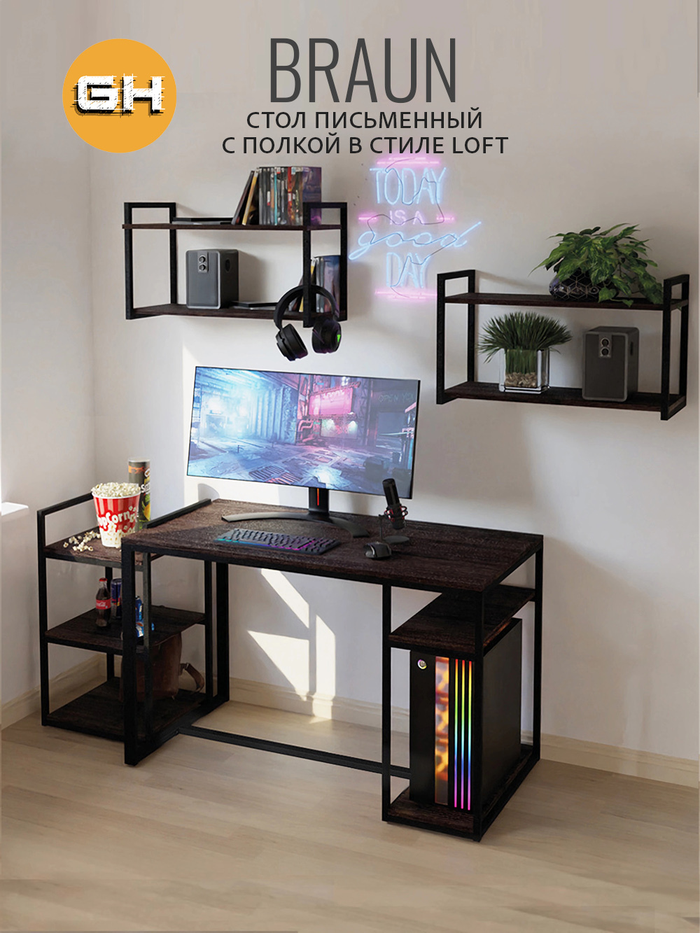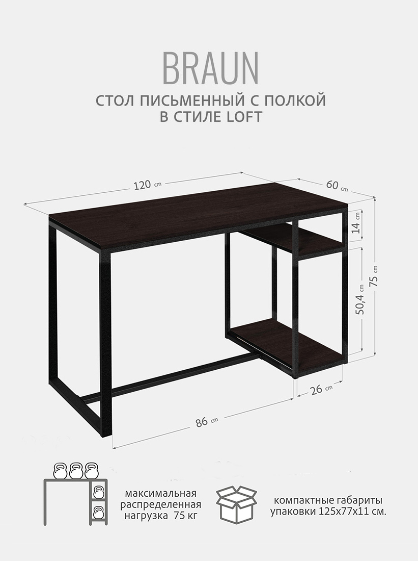 Письменный стол Braun изготовлен в стиле LOFT. Классическая модель компьютерного стола сочетает в себе оригинальный дизайн, практичность и качество. Стол идеально подойдет для работы и учебы, как письменный стол для школьника, стол офисный, модуль для ресепшена и для организации домашнего рабочего пространства.Универсальная конструкция компьютерного стола позволяет менять расположение полки на левую и на правую сторону. Стол можно разместить в прямом и угловом положении. Благодаря этому, изделие отлично впишется в комнату, офис, рабочий кабинет и в помещении любых форм и размеров.Стол Braun имеет дополнительную подставку под процессор и полку под канцелярские принадлежности, а также усилен траверсой для дополнительной устойчивости. Металлическая конструкция выполнена из профильной трубы 40 х 20 см и 20х20 см, что позволяет выдерживать нагрузку 180 кг. Столешница изготовлена из высококачественного ЛДСП, специальное ламинированное покрытие делает ее ударопрочной и не царапающейся, а также защищает от влаги. На широкой столешнице можно свободно разместить ноутбук, настольную лампу, письменные принадлежности и другие предметы, необходимые для работы.В комплект к письменному столу идеально подойдут: