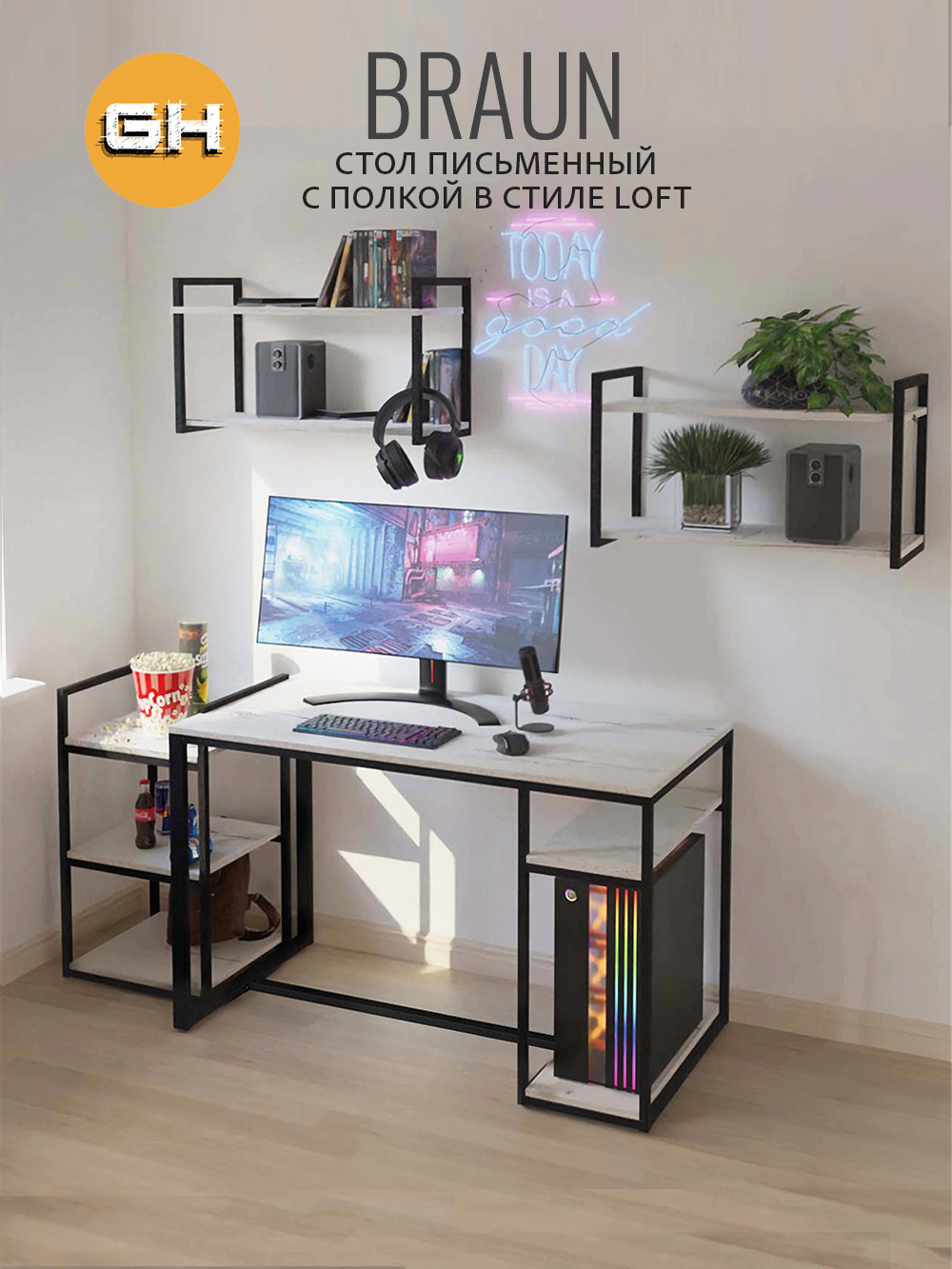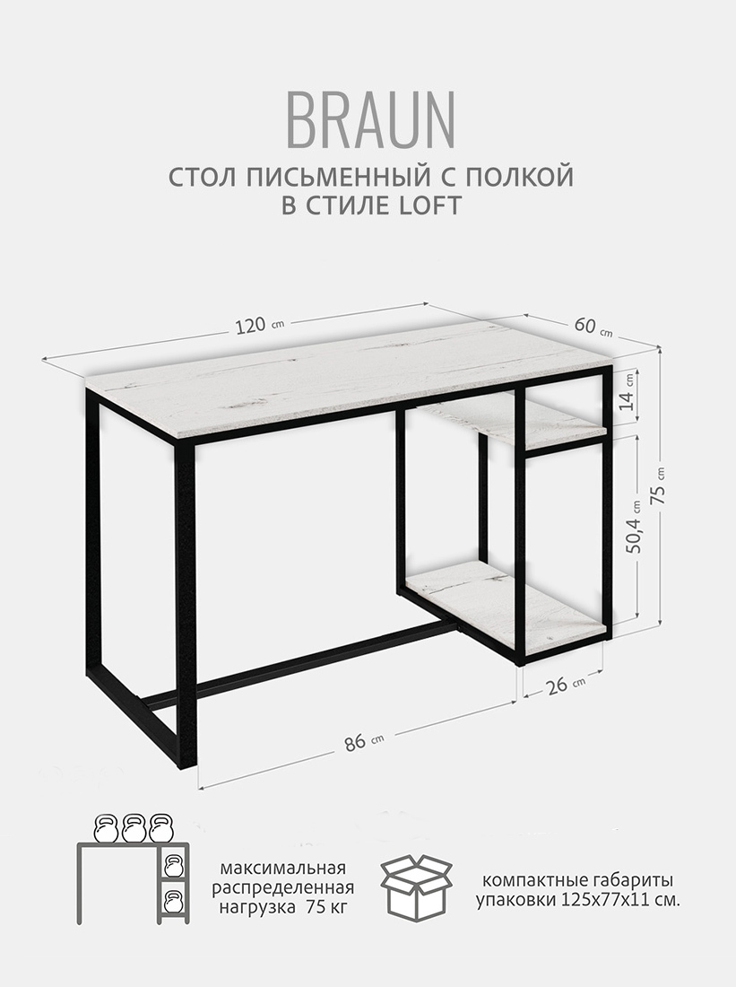 Письменный стол Braun изготовлен в стиле LOFT. Классическая модель компьютерного стола сочетает в себе оригинальный дизайн, практичность и качество. Стол идеально подойдет для работы и учебы, как письменный стол для школьника, стол офисный, модуль для ресепшена и для организации домашнего рабочего пространства.Универсальная конструкция компьютерного стола позволяет менять расположение полки на левую и на правую сторону. Стол можно разместить в прямом и угловом положении. Благодаря этому, изделие отлично впишется в комнату, офис, рабочий кабинет и в помещении любых форм и размеров.Стол Braun имеет дополнительную подставку под процессор и полку под канцелярские принадлежности, а также усилен траверсой для дополнительной устойчивости. Металлическая конструкция выполнена из профильной трубы 40 х 20 см и 20х20 см, что позволяет выдерживать нагрузку 180 кг. Столешница изготовлена из высококачественного ЛДСП, специальное ламинированное покрытие делает ее ударопрочной и не царапающейся, а также защищает от влаги. На широкой столешнице можно свободно разместить ноутбук, настольную лампу, письменные принадлежности и другие предметы, необходимые для работы.В комплект к письменному столу идеально подойдут: