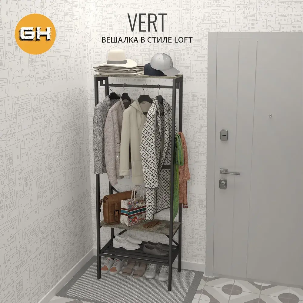 Вешалка напольная VERT в стиле лофт станет отличным дополнением к мебели для дома. Идеально подходит для прихожей, обеспечивая удобное хранение вещей. Эта гардеробная система хранения включает в себя стеллаж напольный с металлическими и деревянными элементами, предусматривающими полку для обуви и штангу для одежды.Вешалка для одежды позволяет разместить большое количество предметов гардероба, поддерживая порядок. Шкаф для одежды может заменить собой полноценный шкаф пенал или шкаф пенал с полками в прихожую. Стойка для одежды добавят пространства для размещения аксессуаров.