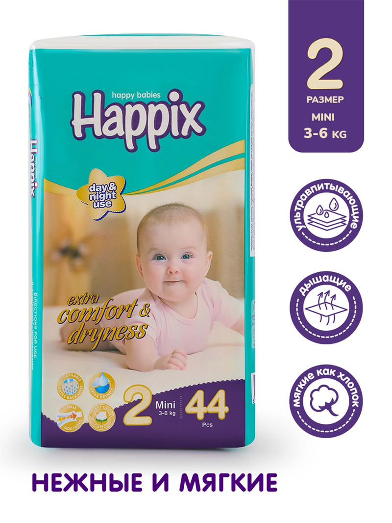 Артикул: Подгузники HAPPIX Super Dry ультратонкие 2 (3-6 кг) 44 шт.