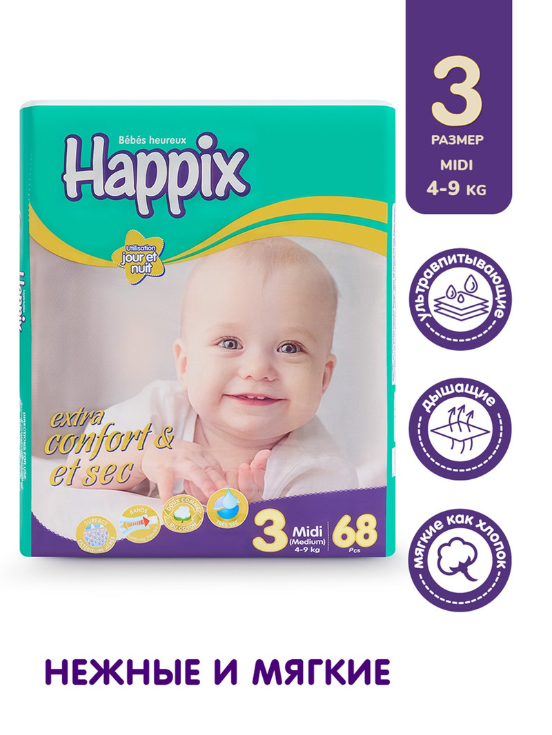 Артикул: Подгузники HAPPIX Super Dry ультратонкие 3 (4-9 кг) 68 шт.