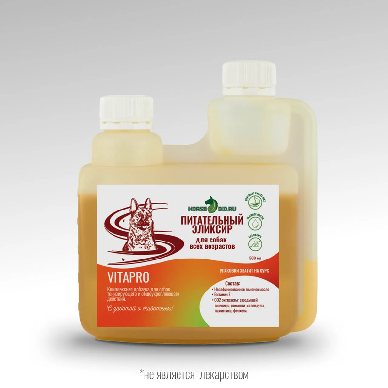 Чтобы купить Эликсир ПИТАТЕЛЬНЫЙ VitaPro на основе льняного масла для собак всех возрастов, 500 мл 13-01VP0500 оптом по цене 1523 руб., свяжитесь с поставщиком. Компания поставщик — Horse-Bio (ИП «Труберг Екатерина Александровна») из города Химки (Московская область). Доставка возможна самовывоз, транспортной компанией, курьером. Способы оплаты: безналичная оплата, наличными.