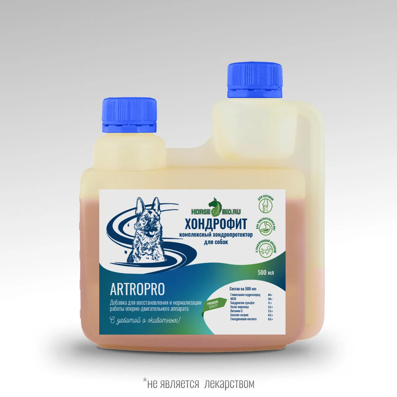 Для собак крупных пород рекомендуются хондропротекторы с хондроитином и глюкозамином в жидкой форме, такие как Хондрофит АртроПро. Жидкая форма лучше усваивается и подходит для длительного применения.