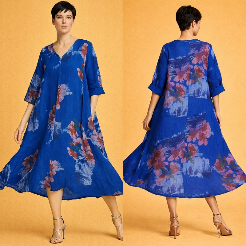 Изысканное льняное платье Azure Bloom — воплощение утончённой элегантности и современного комфорта. Лёгкая, дышащая ткань премиального качества мягко струится по силуэту, создавая ощущение свободы и естественной роскоши.