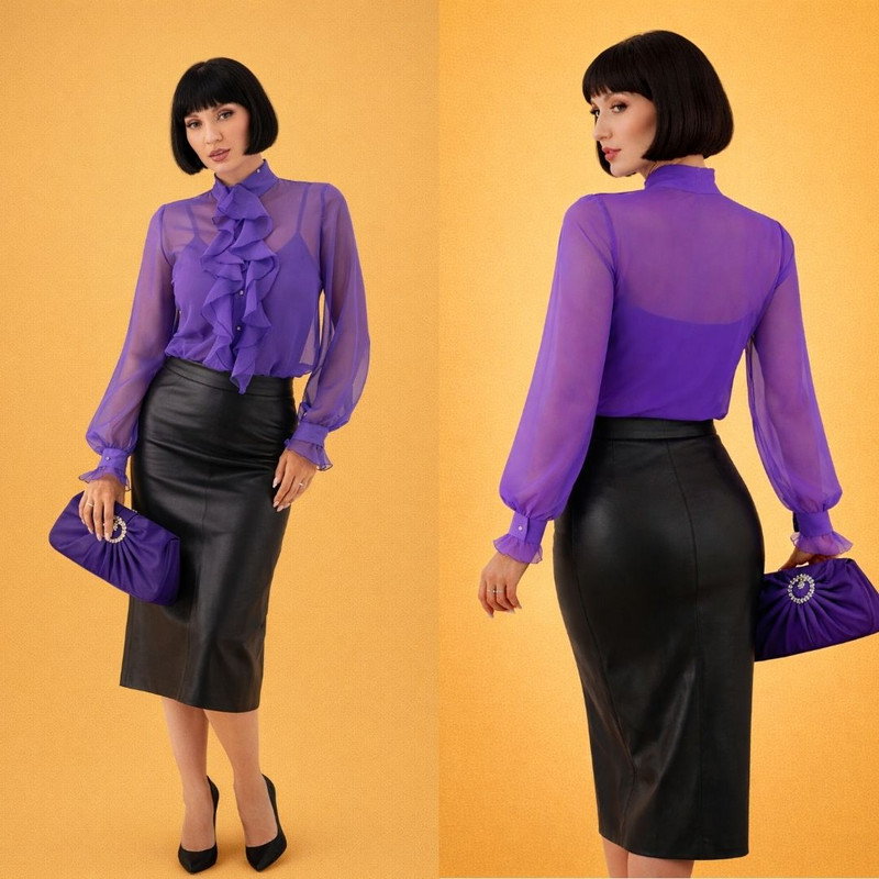 Модель выполнена из воздушного полупрозрачного шифона нежного пурпурного оттенка, который мягко струится по силуэту и создаёт ощущение лёгкости и элегантности. Выразительный воротник с изящными рюшами придаёт образу романтичный характер и утончённую динамику.