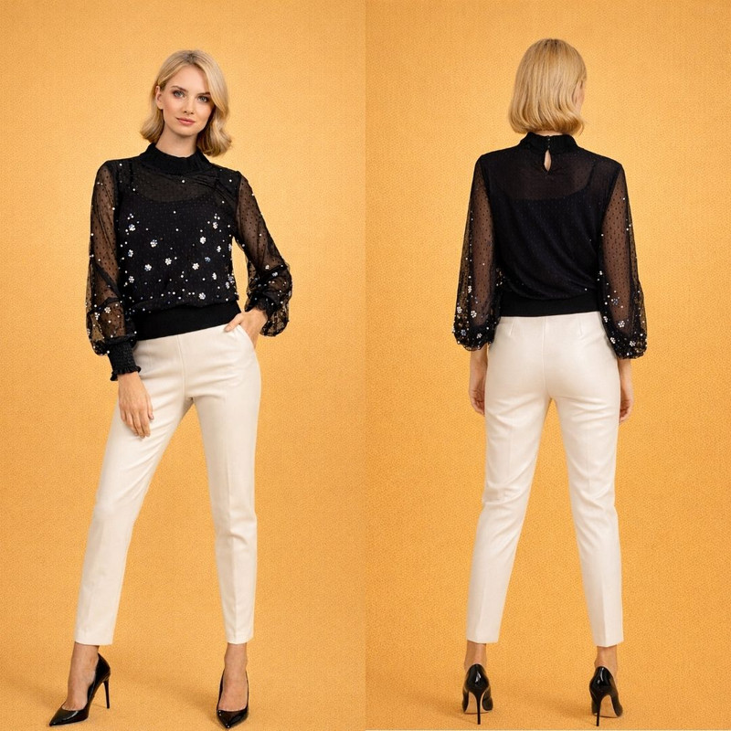 Свободный, но элегантно сбалансированный силуэт красиво подчёркивает фигуру и делает блузу универсальным элементом гардероба. Она легко переходит из дневного элегантного образа в вечерний стиль для особых случаев.
