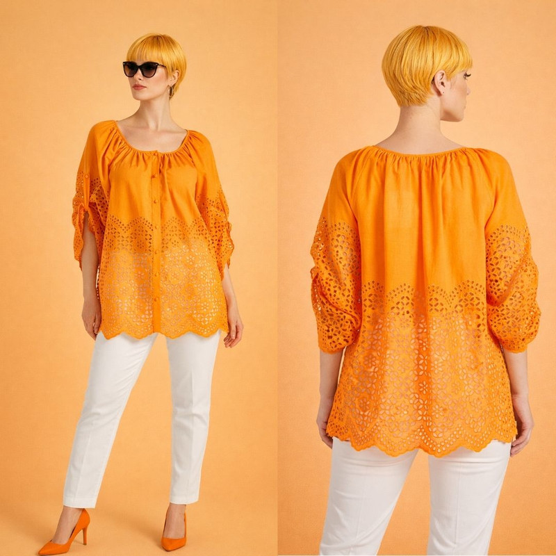 Модель выполнена из лёгкой дышащей ткани, которая мягко ложится по силуэту и дарит ощущение комфорта на протяжении всего дня. Насыщенный солнечно-оранжевый оттенок придаёт образу энергию и свежесть, превращая блузу в выразительный акцент гардероба.