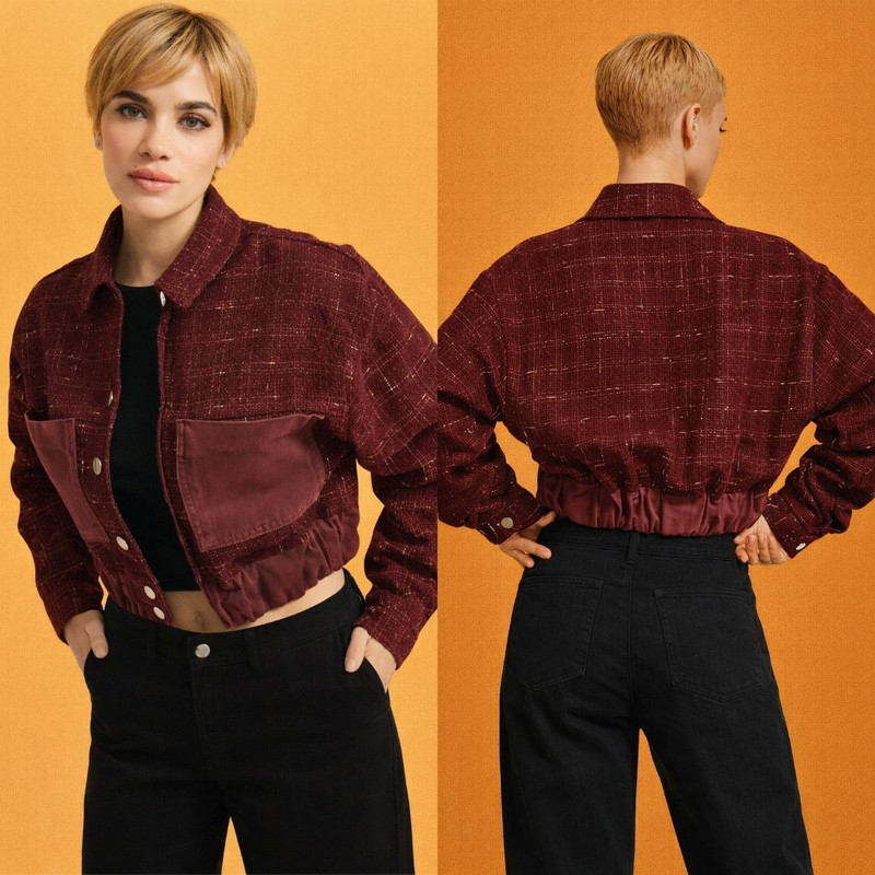 Куртка-бомбер Bordeaux Élan — это выразительное сочетание современной женственности, уверенного характера и утончённой роскоши. Модель выполнена из фактурного твида с изысканными сатиновыми вставками, создающими богатую текстуру и элегантную глубину образа.