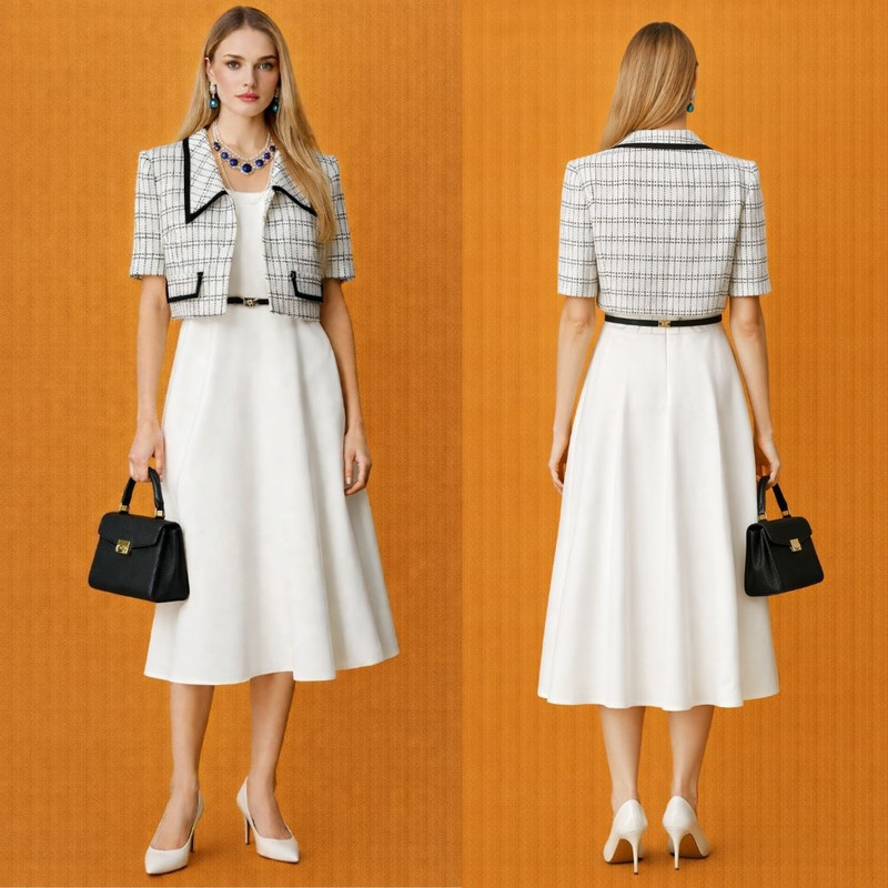 Платье — воплощение утончённой женственности и современной элегантности. Изысканный силуэт создаётся благодаря идеально скроенному укороченному жакету с деликатной чёрной окантовкой, который гармонично сочетается с плавно ниспадающей юбкой миди цвета айвори.