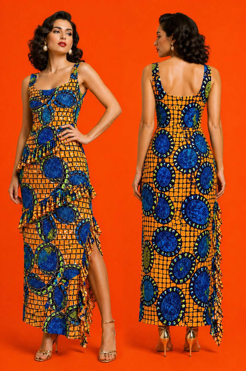 Макси-платье Aurora Heritage, выполненное из высококачественного дышащего хлопка, является воплощением элегантности и культурного наследия. Яркий геометрический принт, вдохновленный традиционными текстильными мотивами, гармонично сочетается с идеально скроенным лифом и лаконичной закрытой спинкой, создавая утончённый силуэт.