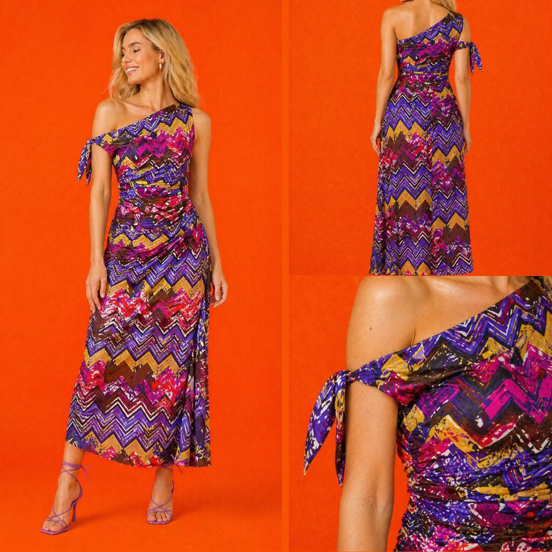 Модель украшена выразительным зигзагообразным принтом в насыщенных оттенках фиолетового, фуксии, золотого и глубокого сливового, создающим динамичный и запоминающийся образ. Асимметричный крой на одно плечо придаёт современный характер, а мягкие драпировки подчёркивают фигуру, добавляя образу женственности и утончённости. Идеальный выбор для особых мероприятий, летних вечеров и стильных выходов.