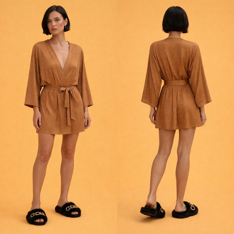 Минималистичный дизайн без лишних деталей раскрывает чистоту формы, а пояс деликатно акцентирует талию, создавая изящный и уверенный образ. Идеально подходит как для роскошного домашнего отдыха, так и для стильных приватных встреч.