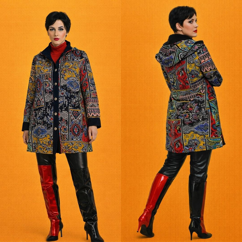 Приталенный силуэт подчёркивает фигуру, сохраняя при этом лёгкость движения и комфорт. Контрастная чёрная отделка вдоль планки и манжет придаёт дизайну элегантную чёткость, балансируя между яркой художественной выразительностью и современной утончённостью.