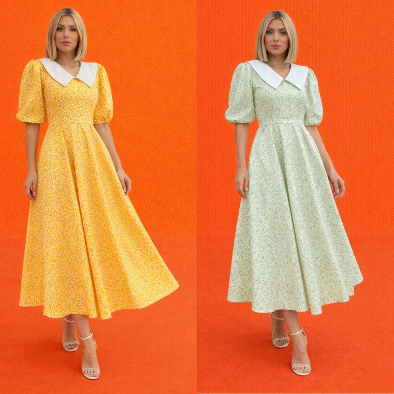 Это изысканное платье создано, чтобы подчеркнуть естественную грацию силуэта. Акцентный воротник деликатно обрамляет линию декольте, придавая образу благородную выразительность, а объемные рукава добавляют лёгкий оттенок couture-эстетики. Приталенный крой плавно переходит в струящуюся юбку А-силуэта, создавая эффект лёгкости и гармоничного движения.