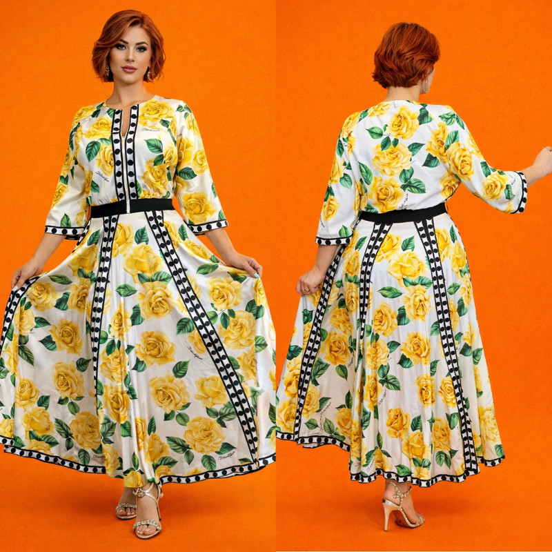 Эксклюзивный принт с золотистыми розами придаёт образу нотки романтики и аристократического шарма, в то время как безупречно выверенный силуэт с акцентом на талии подчёркивает женственность и элегантность. Каждая деталь продумана до совершенства, создавая гармонию между классикой и современным стилем.