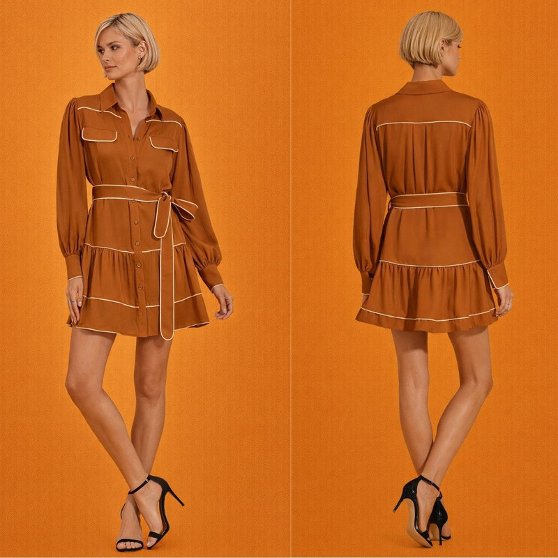 Элегантное мини-платье рубашечного кроя в тёплом природном оттенке, созданное для современной роскоши и уверенного стиля.
