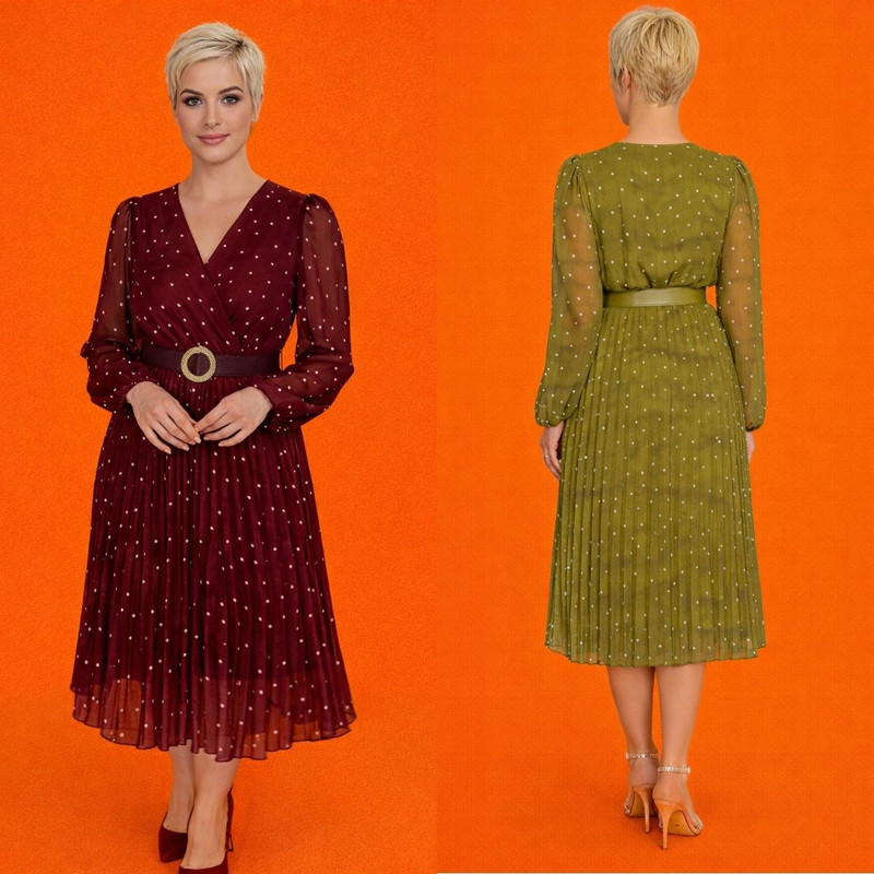 Деликатный узор в мелкий горошек придаёт образу изящную глубину, а идеально выверенный крой с акцентом на талии подчёркивает женственность, формируя утончённый и гармоничный силуэт. Полупрозрачные рукава и струящаяся плиссированная юбка добавляют образу романтичности и благородного шарма.