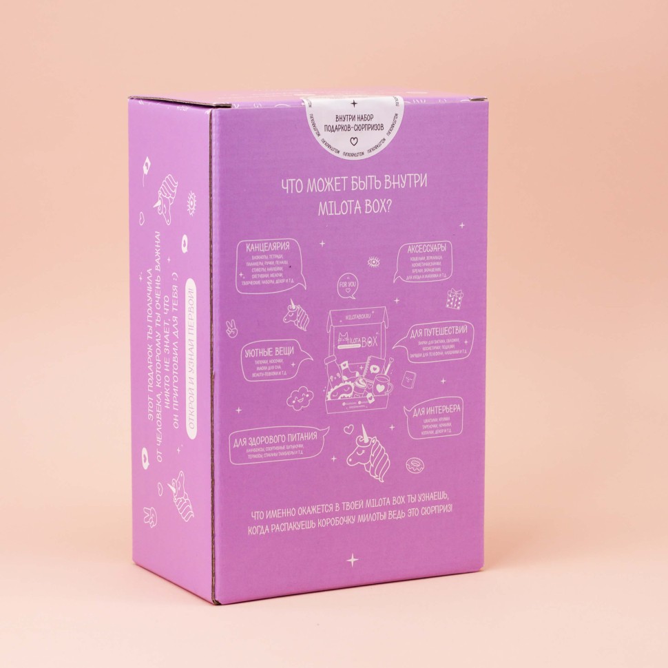 Каждая коробочка милоты наполнена необычными вещицами, которыми будет приятно пользоваться в повседневной жизни: милая канцелярия, уютные товары для дома, стильные аксессуары, предметы для здорового образа жизни и приятные мелочи. Внутри Milota BOX находится до 8 сюрпризов, упакованных в стилизованную подарочную бумагу тишью.