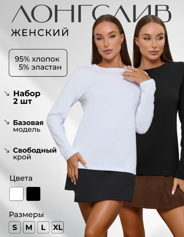 Лонгслив женский. Размеры S-XL. Состав 95% хлопок, 5% эластан. Крой классический.