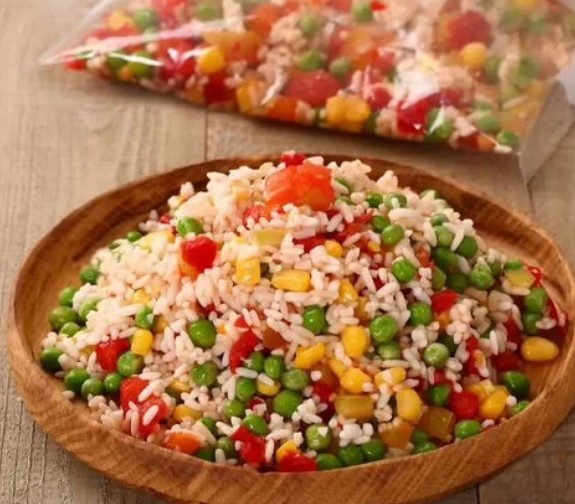 Состав: кукуруза мини, горошек зеленый, морковь, рис.