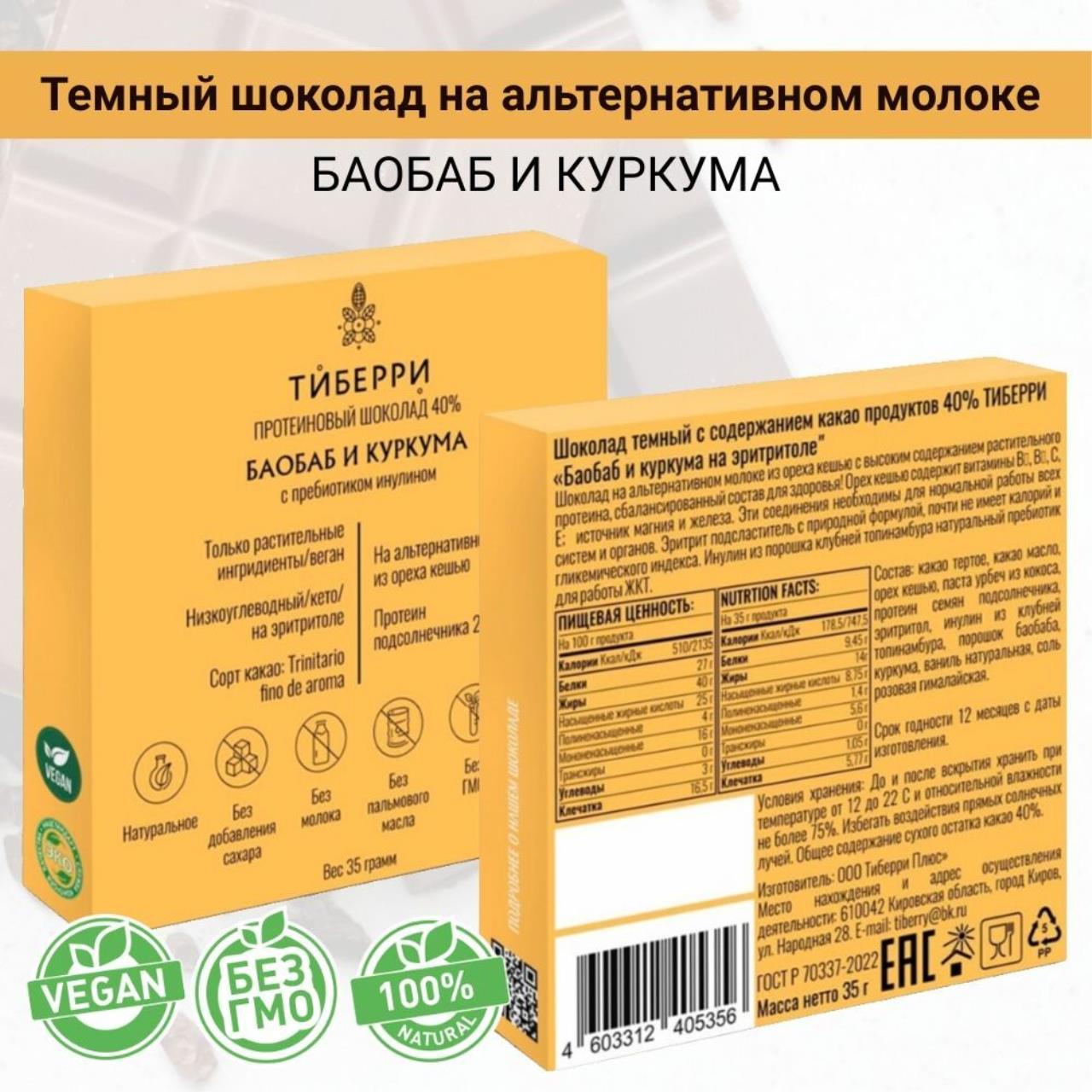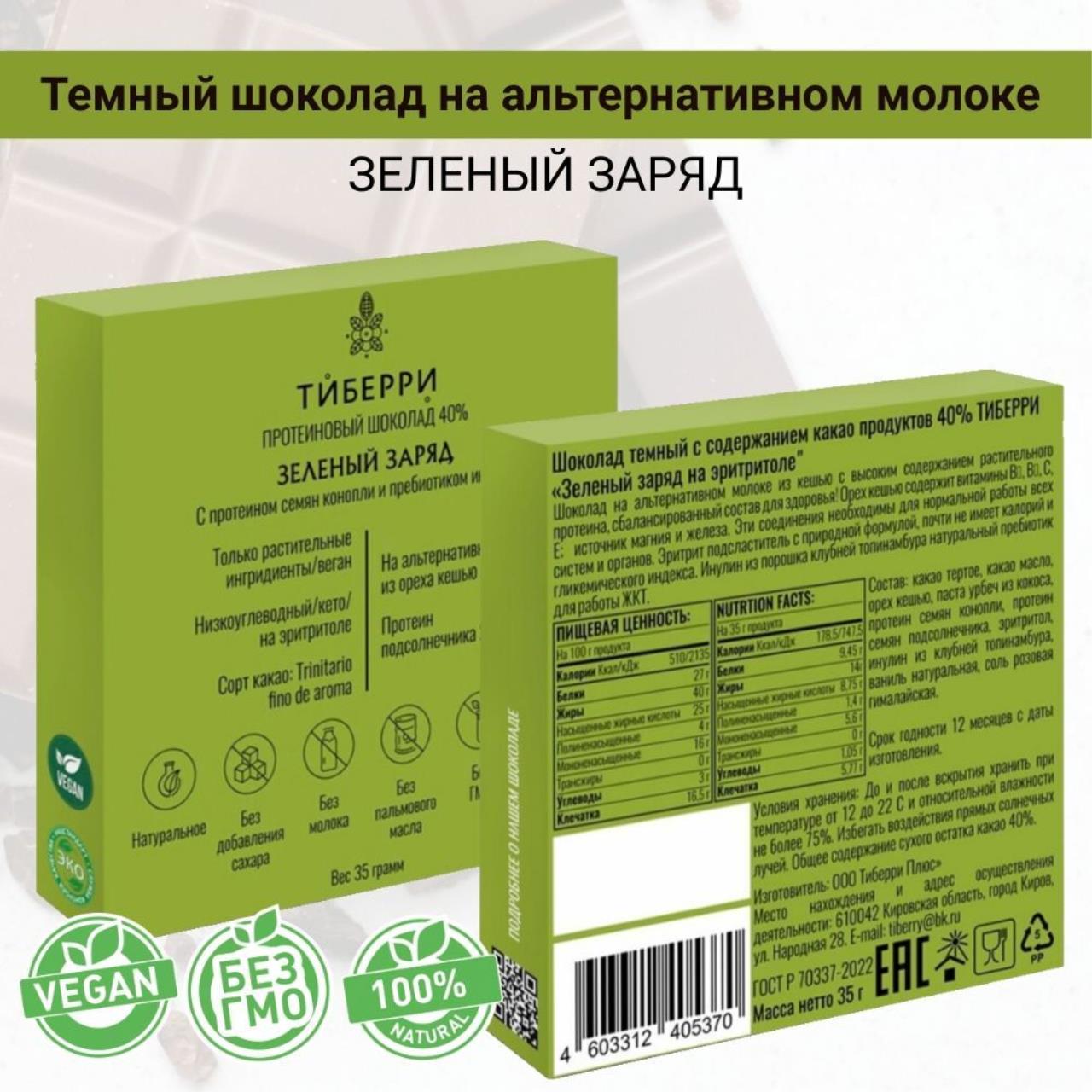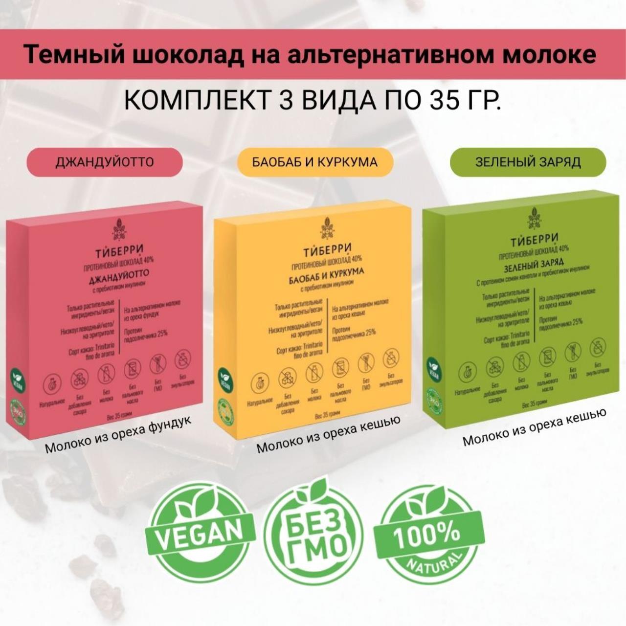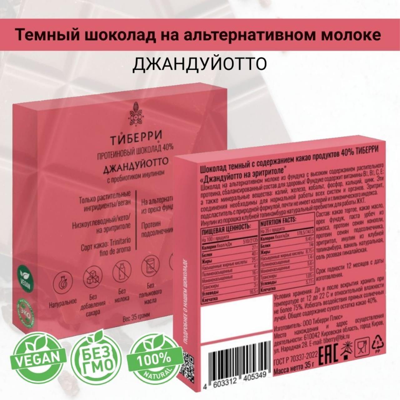 Шоколад Тиберри создан на основе альтернативного молока с использованием природного подсластителя эритритола. Содержит растительный протеин и пребиотик - инулин. Это низкокалорийный продукт без ГМО, молока и пальмового масла.