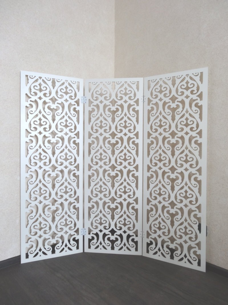 Ширма ажурная со сквозным узором белого цвета, торцы узора светло-бежевые.