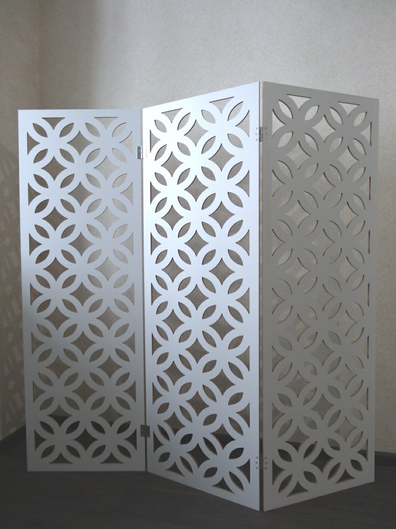 Изготовлена из ламинированного МДФ толщиной 0,8см, с 3 створками, каждая из которых размером 50х150 см.