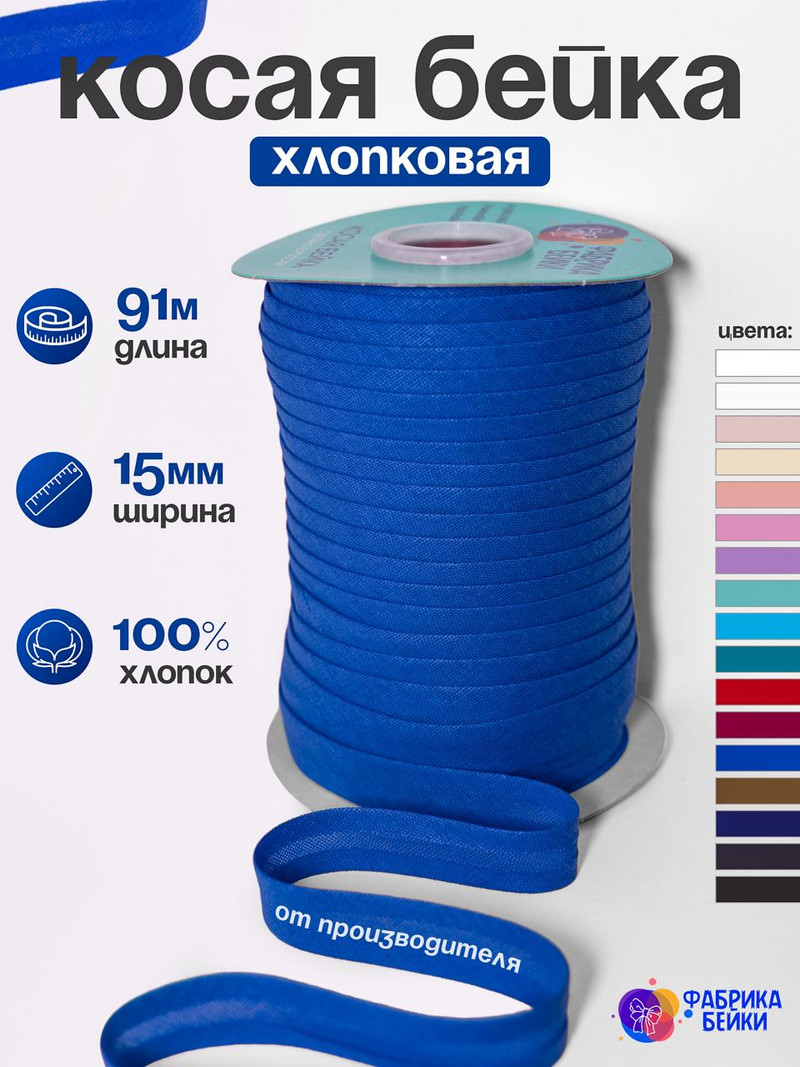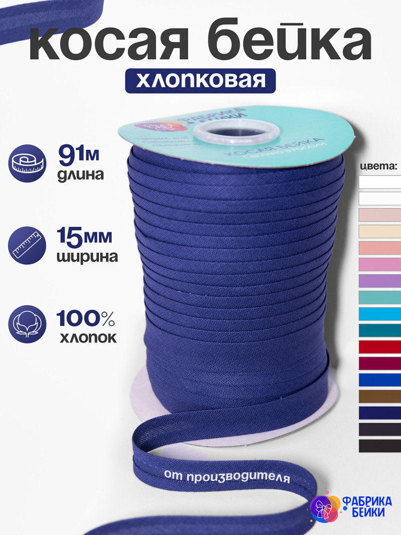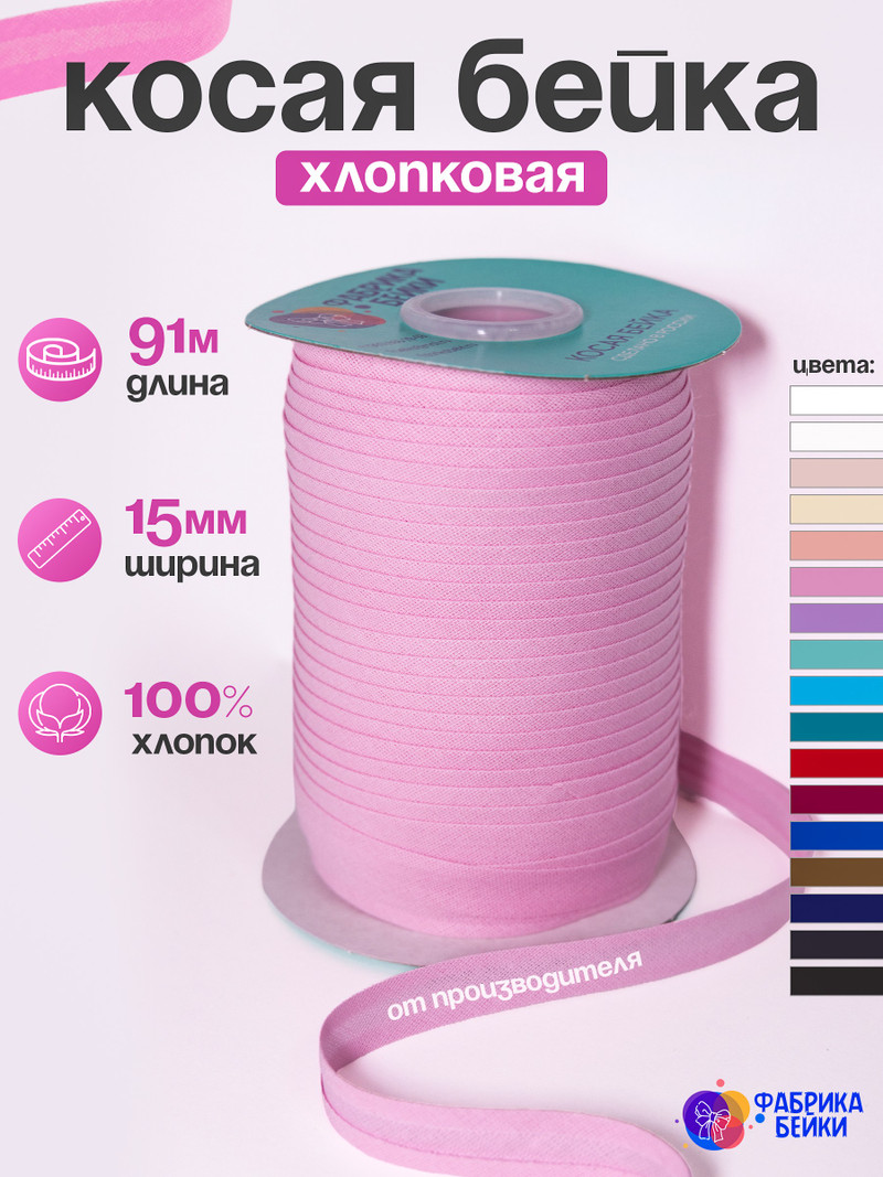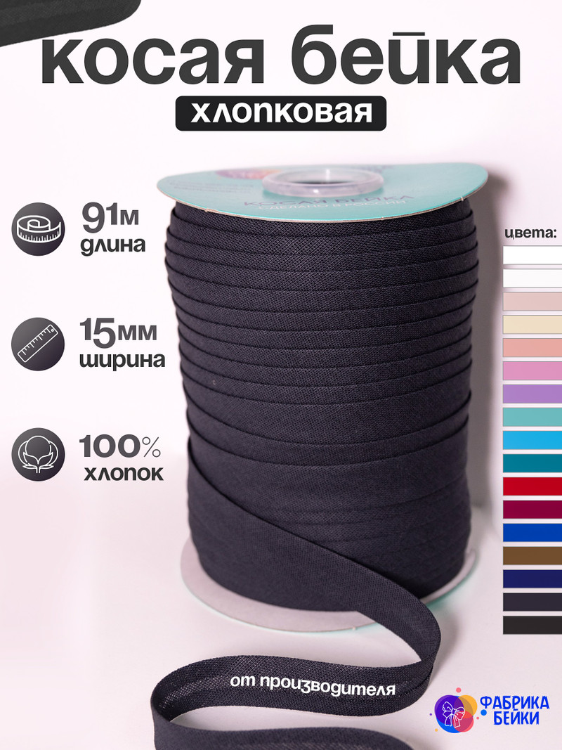 Косая бейка хлопок. Производство и оптовая продажа косой бейки хлопковой. Большой выбор цветов. Ширина 15 мм, длина 91 метр. Так же в наличии 132 метра. В наличии более 17 цветов.