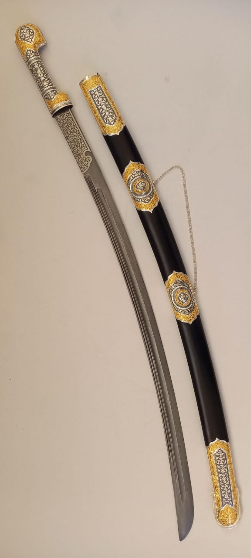 Шашка серебряная, позолоченная. Глубокая ручная гравировка, чернь, чеканка. Работа Кубачинского мастера особой сложности. Клинок изготовлен из дамаской стали, с травленным узором на клинке.