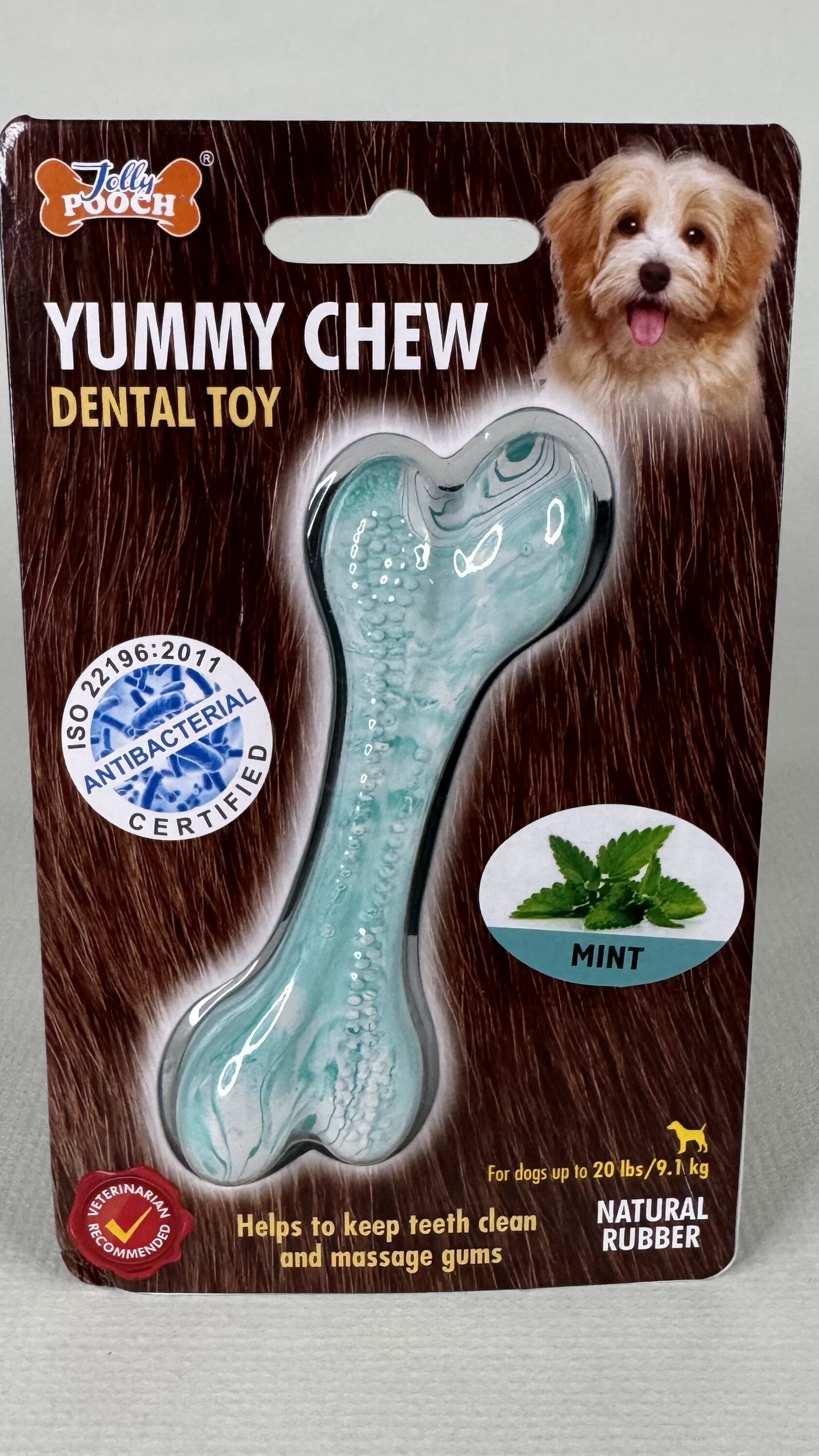 Согласно исследованию Американского ветеринарного стоматологического колледжа (AVDC), более 70% собак в возрасте старше 3 лет страдают от некоторых заболеваний парадокса. Уход за зубами играет важную роль в общем здоровье и благополучии собаки. Зубная игрушка Yummy Chew разработана с наконечниками, которые тщательно чистят зубы, удаляя налет и зубной камень, а также нежно массируют десны и глубоко очищают язык, чтобы поддерживать свежее дыхание. В производственный процесс была включена антимикробная добавка, чтобы достичь показателя 99,99% отсутствия бактерий в течение срока службы зубной игрушки Yummy Chew. Исследования и результаты независимых лабораторных испытаний показали, что зубная игрушка Yummy Chew убивает микроорганизмы, препятствуя росту бактерий, плесени и грибков.