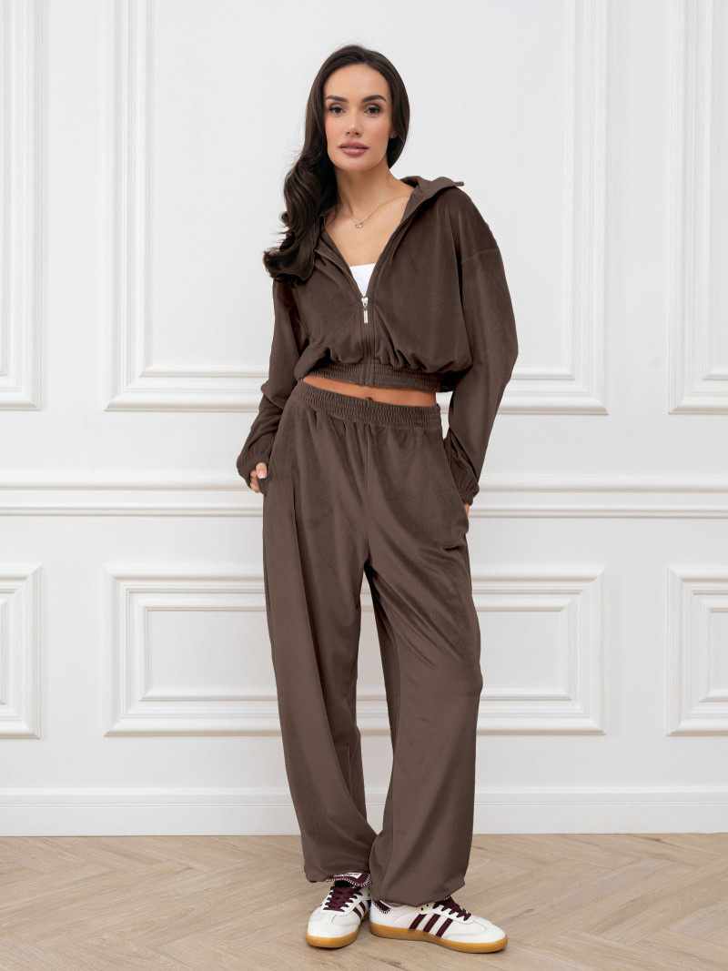 Легкий, но теплый велюр идеально подходит для демисезона, когда погода переменчива. Костюм можно носить как для прогулок, так и для повседневных дел, сочетая с кроссовками, кедами или модными ботинками.