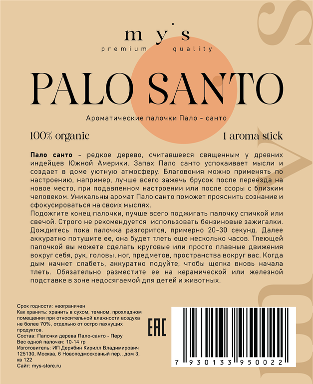 Чтобы купить Аромат для дома Благовония Пало Санто my’s PALO SANTO 1 палочка оптом по цене 315 руб., свяжитесь с поставщиком. Компания поставщик — My's (ИП «Дерябин Кирилл Владимирович») из города Москва. Доставка возможна транспортной компанией, самовывоз, курьером. Способы оплаты: безналичная оплата, наличными.
