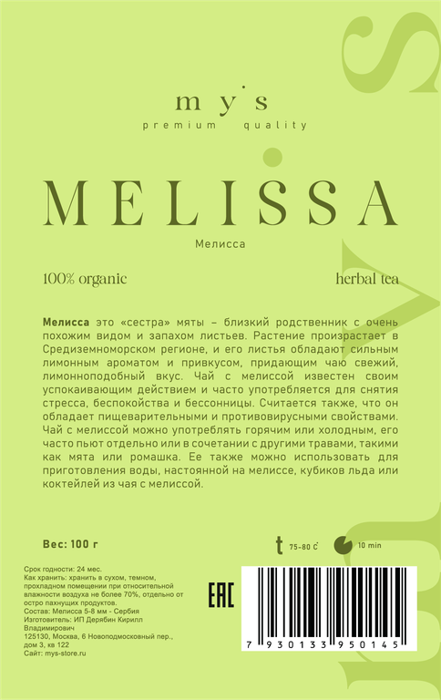 Чтобы купить Травяной чай из Мелиссы my’s MELISSA, 100 г оптом по цене 405 руб., свяжитесь с поставщиком. Компания поставщик — My's (ИП «Дерябин Кирилл Владимирович») из города Москва. Доставка возможна транспортной компанией, самовывоз, курьером. Способы оплаты: безналичная оплата, наличными.