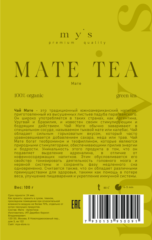 Чтобы купить Зеленый чай Мате my’s MATE TEA, 100 г оптом по цене 415 руб., свяжитесь с поставщиком. Компания поставщик — My's (ИП «Дерябин Кирилл Владимирович») из города Москва. Доставка возможна транспортной компанией, самовывоз, курьером. Способы оплаты: безналичная оплата, наличными.