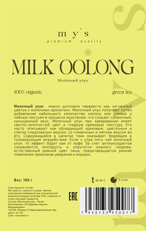 Чтобы купить Зеленый чай Молочный Улун my’s MILK OOLONG, 100 г оптом по цене 455 руб., свяжитесь с поставщиком. Компания поставщик — My's (ИП «Дерябин Кирилл Владимирович») из города Москва. Доставка возможна транспортной компанией, самовывоз, курьером. Способы оплаты: безналичная оплата, наличными.
