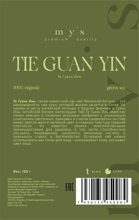 Чтобы купить Зеленый чай Те Гуань Инь my’s TIE GUAN YIN, 100 г оптом по цене 425 руб., свяжитесь с поставщиком. Компания поставщик — My's (ИП «Дерябин Кирилл Владимирович») из города Москва. Доставка возможна транспортной компанией, самовывоз, курьером. Способы оплаты: безналичная оплата, наличными.