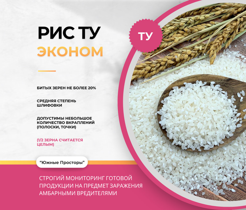 Чтобы купить Рис ТУ Эконом оптом по цене по запросу, свяжитесь с поставщиком. Компания поставщик — Южные Просторы (ИП «Чиркова Инна Владимировна») из города Краснодар (Краснодарский край). Доставка возможна самовывоз, транспортной компанией, железной дорогой.