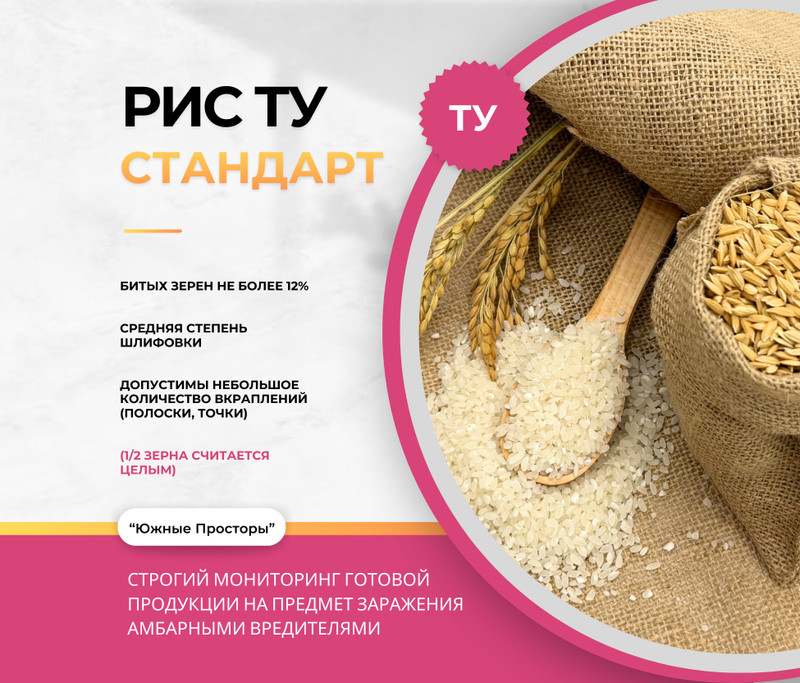 Чтобы купить Рис ТУ Стандарт оптом по цене по запросу, свяжитесь с поставщиком. Компания поставщик — Южные Просторы (ИП «Чиркова Инна Владимировна») из города Краснодар (Краснодарский край). Доставка возможна самовывоз, транспортной компанией, железной дорогой.