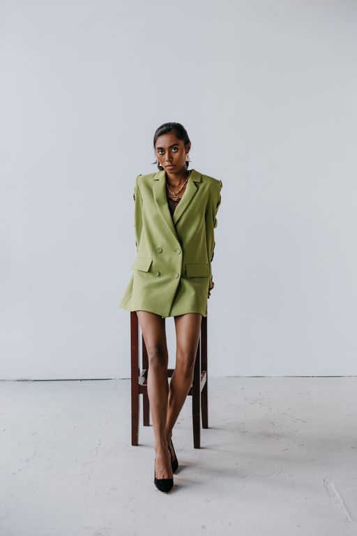 Женский двубортный жакет свободного кроя.