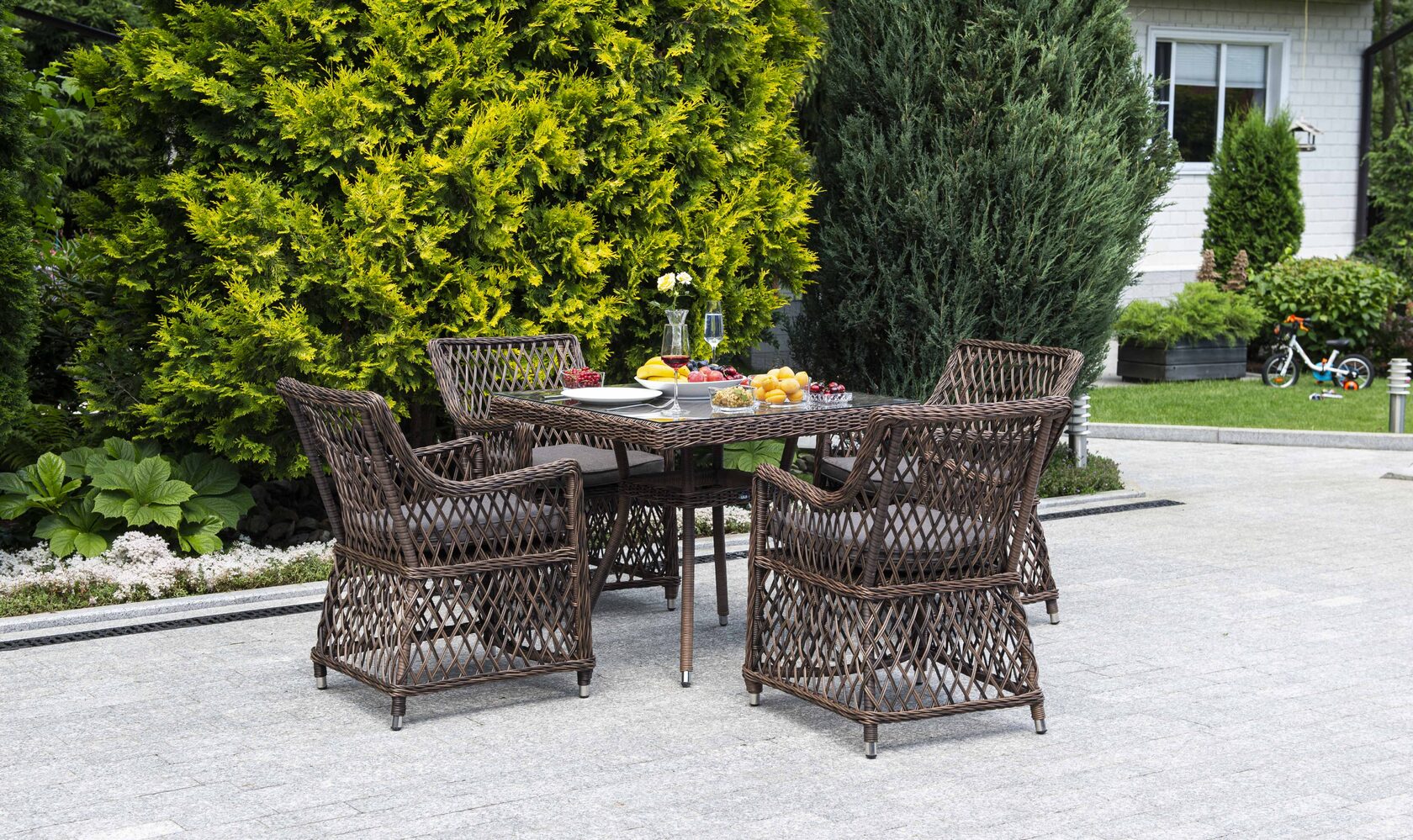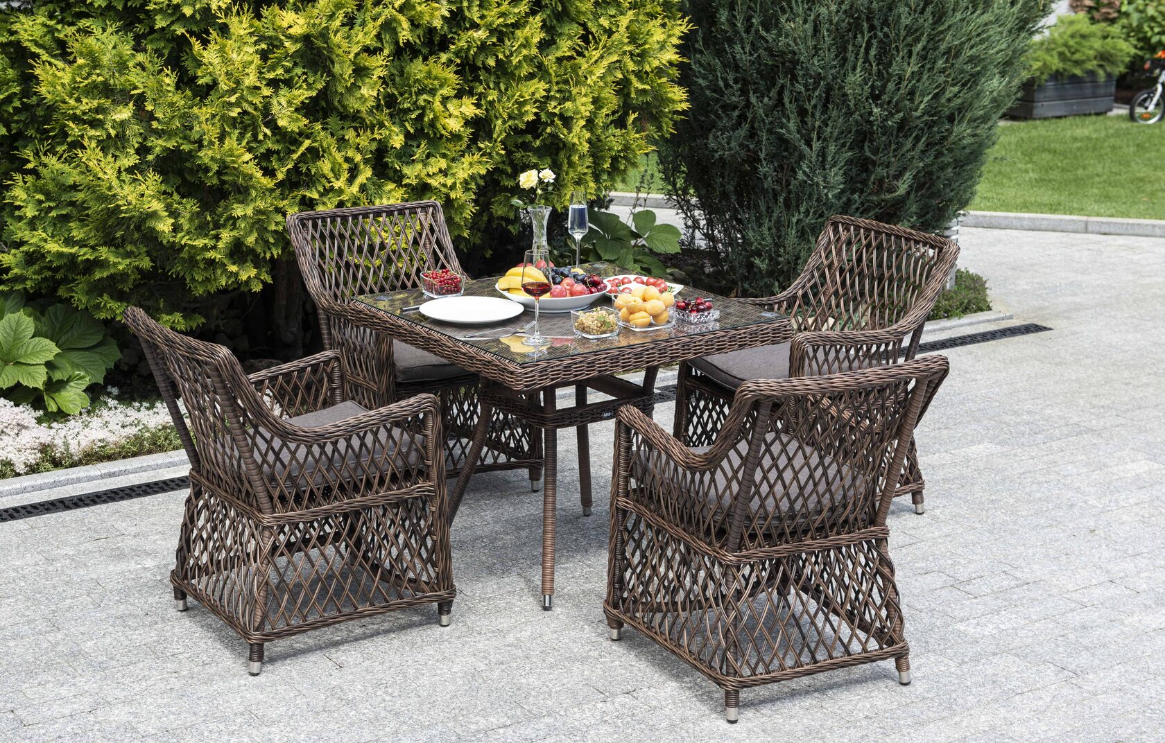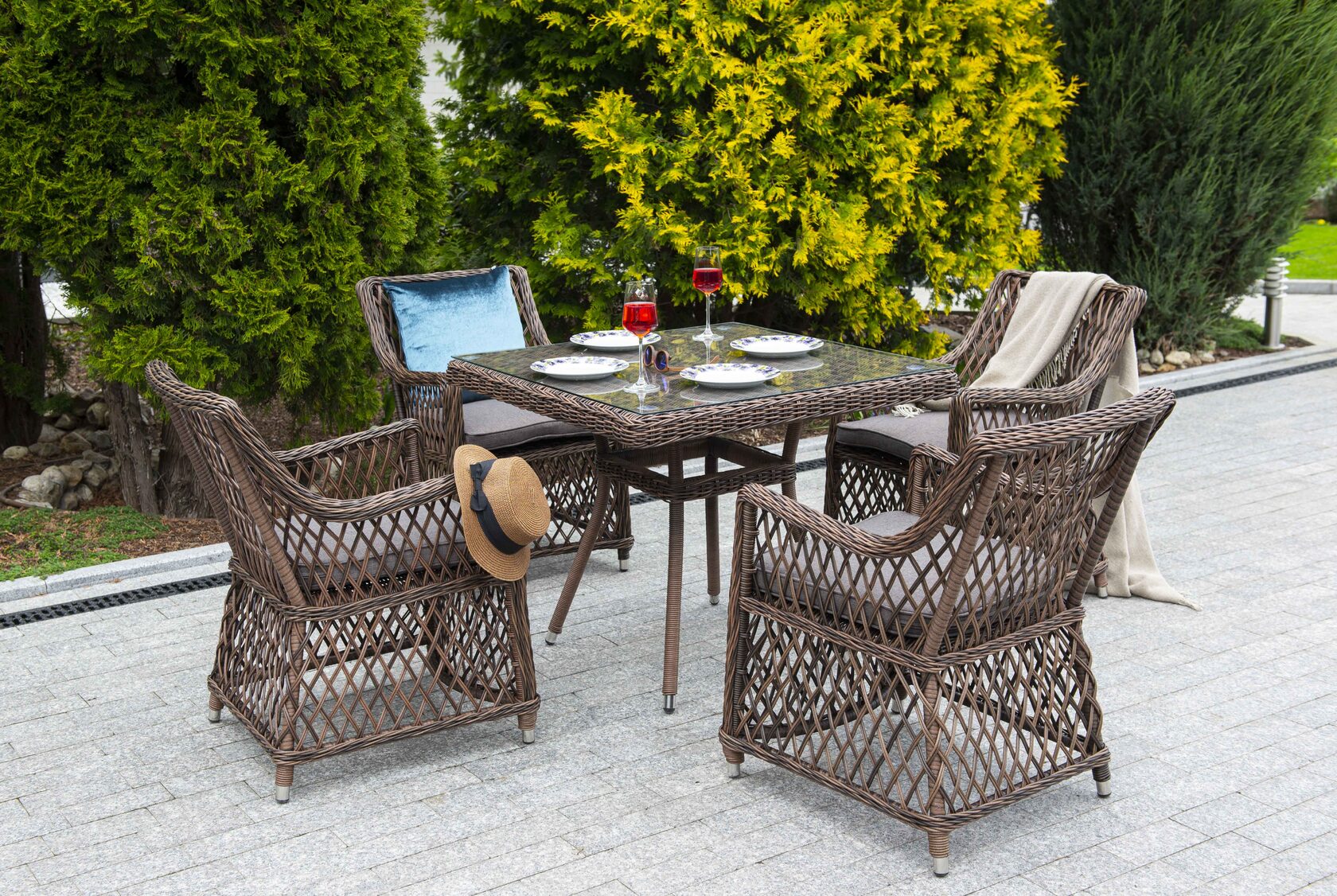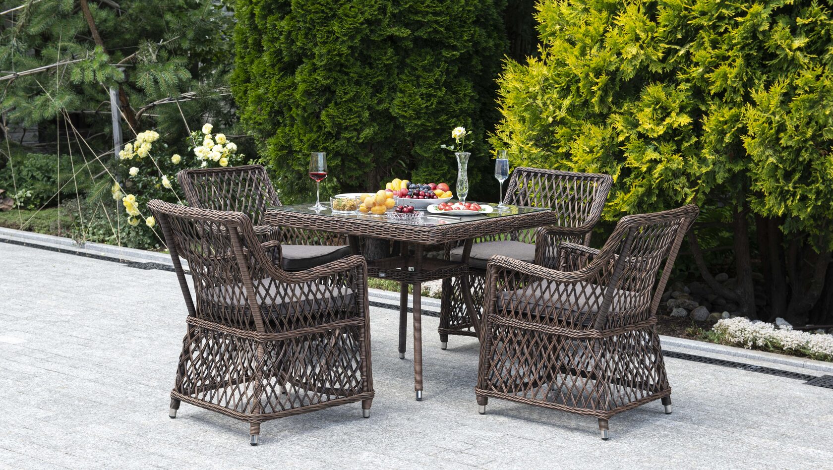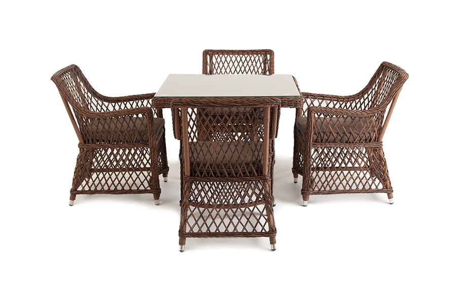 Ротанговая обеденная группа премиум-класса «Айриш». В комплекте: - квадратный обеденный стол «Айриш» (900х900х750 мм) с ударопрочной стеклянной столешницей. - 4 кресла «Латте» ( 550х660х850 мм). Каркас всех изделий изготовлен из легкого алюминия, оплетенного вручную долговечным искусственным ротангом. На креслах предусмотрены подушки со съемными чехлами. Комплект выполнен в насыщенном коричневом цвете, имитирующем натуральную ротанговую лозу. Все элементы можно заказать по отдельности. Набор также доступен в светлом соломенном оттенке. “Айриш” стол плетеный из искусственного ротанга, цвет коричневый 1шт. 900Х900Х750, “Латте” плетеное кресло из искусственного ротанга, цвет коричневый 4шт. 550Х660Х850,