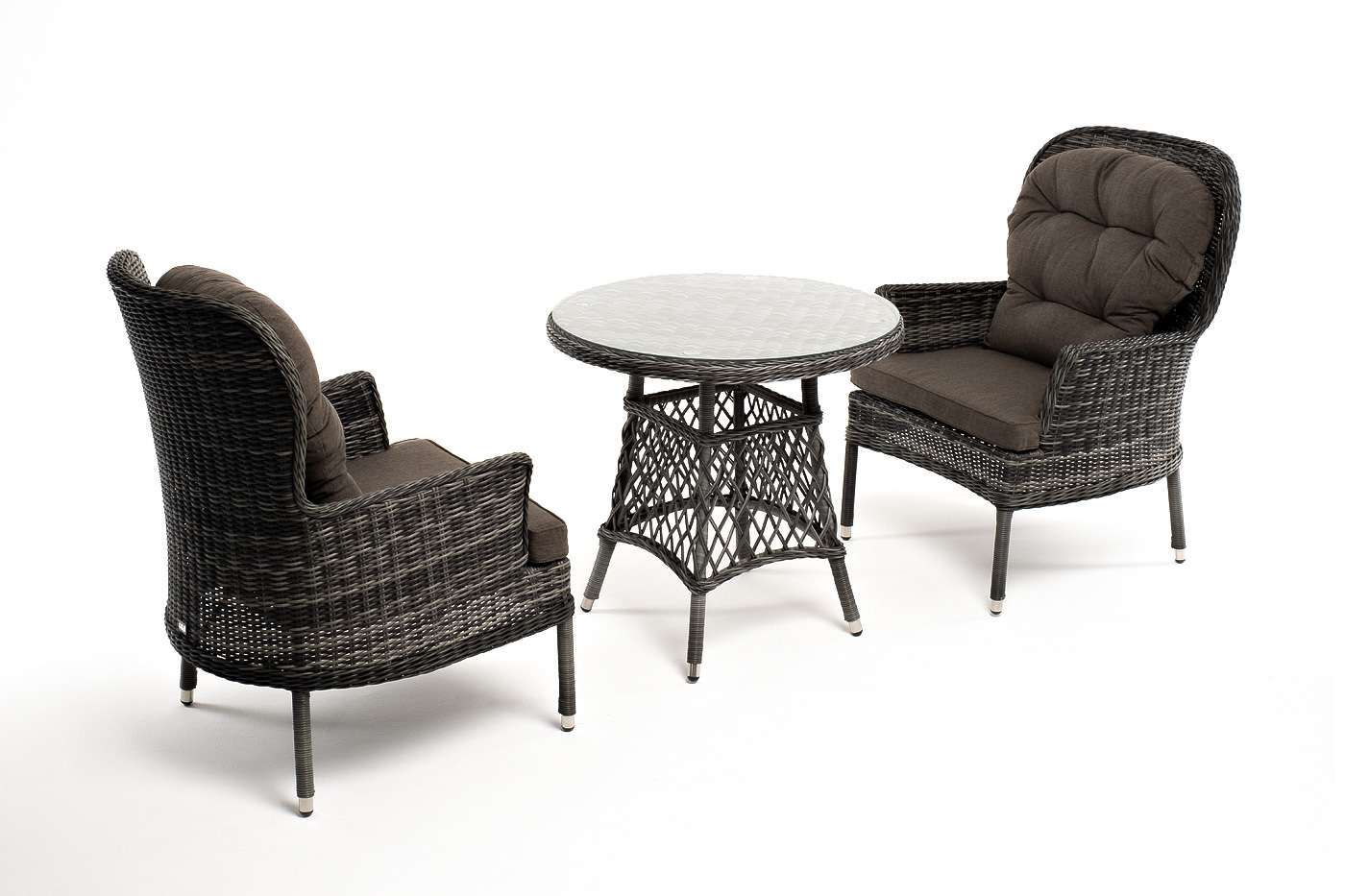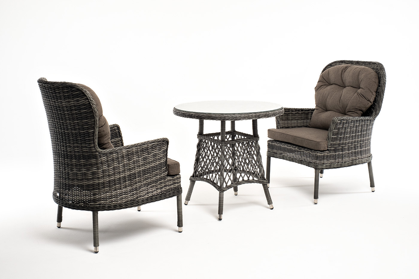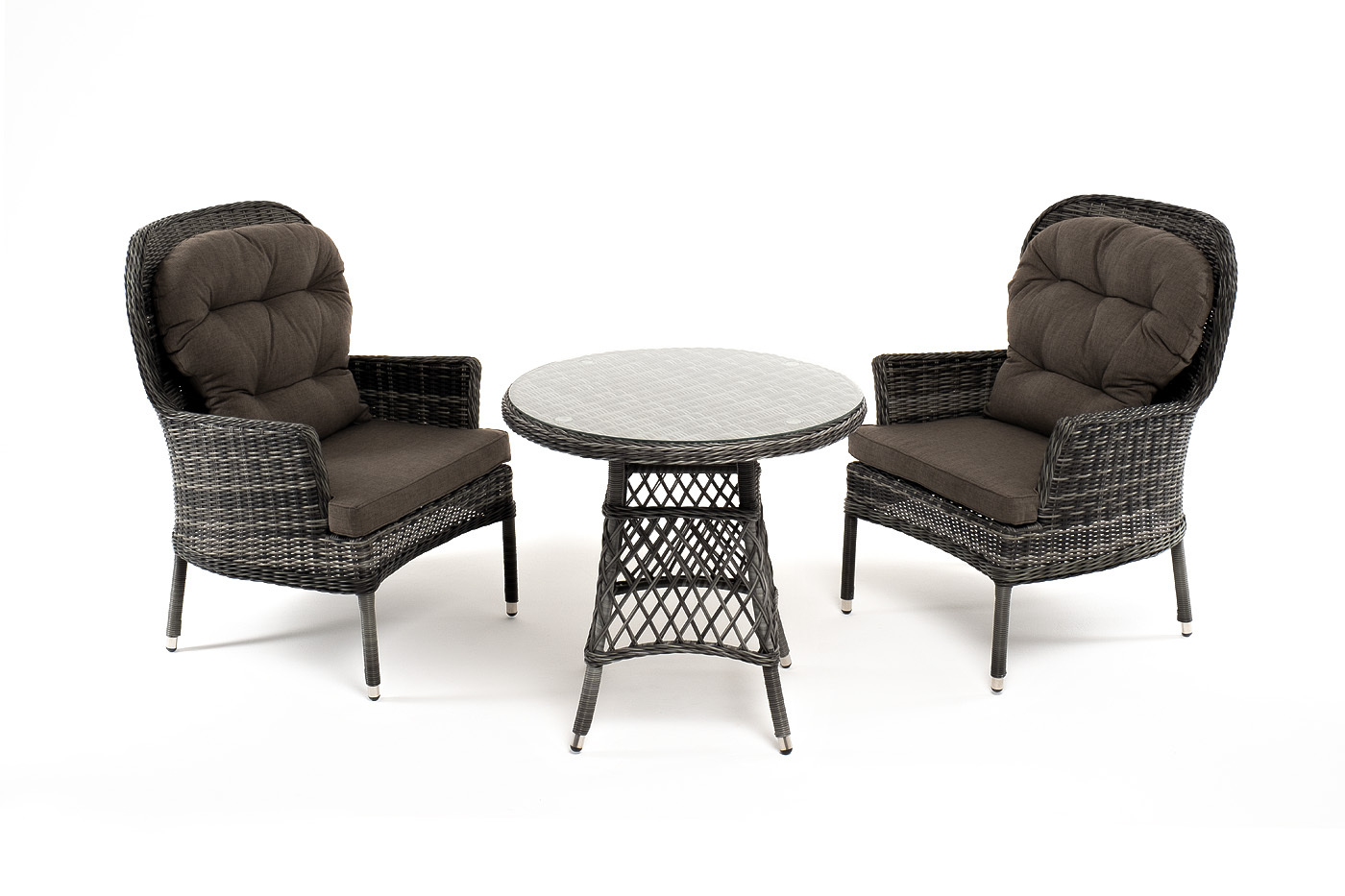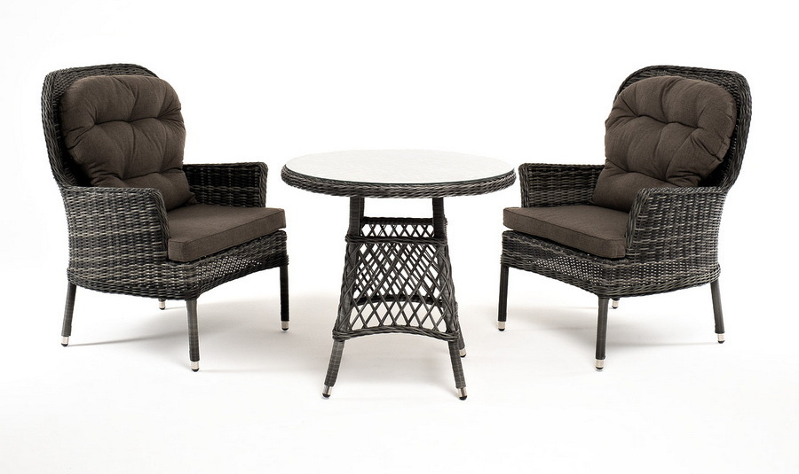 Кофейный комплект «Алиса» рассчитан на 2 персоны и подходит для расположения на балконе, в небольших гостиных, на террасе и других местах с ограниченным пространством. В основе каркас из алюминия. В состав входят: – круглый стол 800×800×750 мм (толщина стеклянной столешницы в 0,5 см). – 2 кресла - 710×820×1105 мм. Плетение выполнено вручную круглым искусственным ротангом графитового цвета, кресло укомплектовано подушками из 100% полиэстера, которые пропитаны специальным составом, обладающим влагоотталкивающим свойством. “Алиса” кресло плетеное, цвет графит с подушками 2шт. 710Х820Х1 105, “Эспрессо” плетеный круглый стол, диаметр 80 см, цвет графит 1шт. 800Х800Х750,