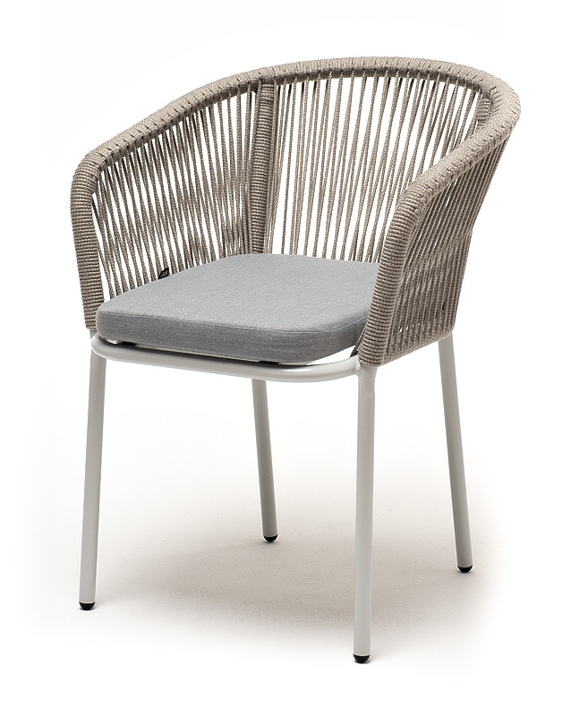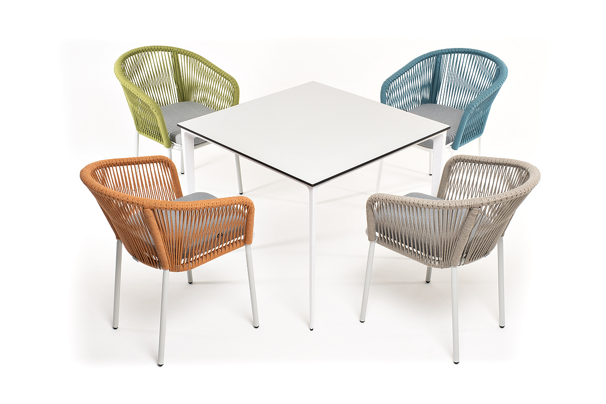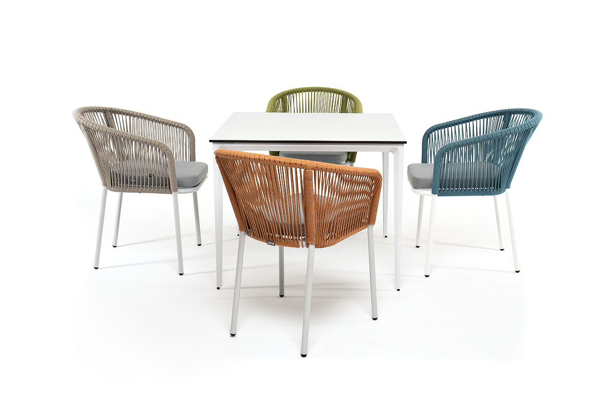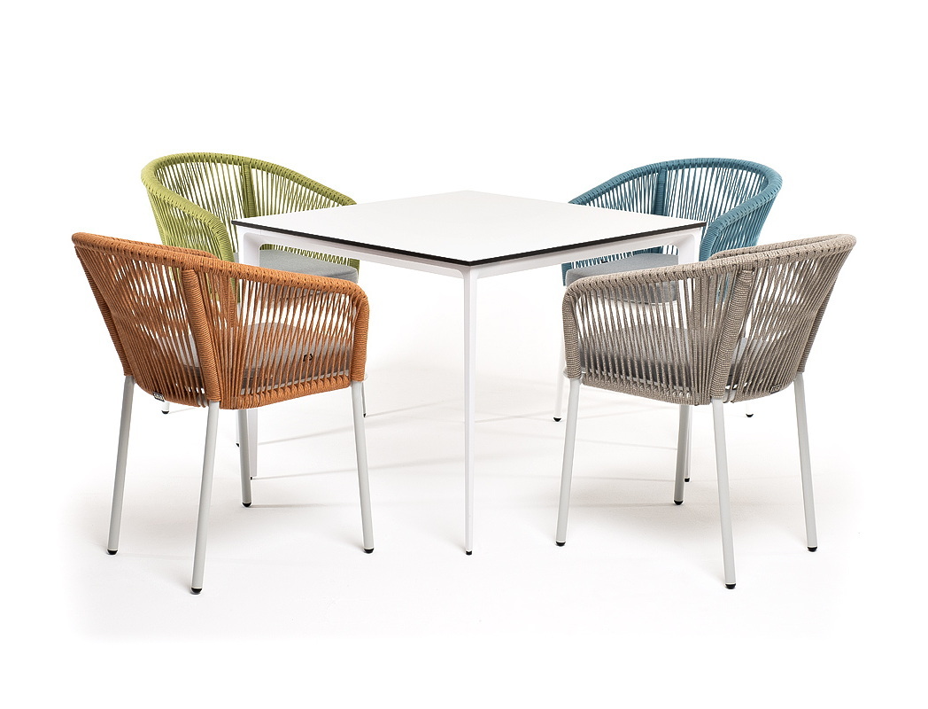 Комплект «Аркобалено» для обустройства обеденной зоны, рассчитан на 4 персоны. В комплект входят: - стол из HPL «Малага» 900х900х750 мм. - стул «Марсель», роуп салатовый меланж - 570х620х775 мм. - стул «Марсель», роуп бирюзовый - 570х620х775 мм. - стул «Марсель», роуп оранжевый меланж - 570х620х775 мм. - стул «Марсель», роуп серый меланж - 570х620х775 мм. Столешница стола «Малага» выполнена из современного высококачественного монолитного компакт-пластик HPL, толщиной 12 мм в молочном цветом. Материал устойчив к высоким температурам, попаданию влаги и может использоваться при любых погодных условиях. Подстолье изготовлено из крашеного алюминия белого цвета. Каркас стульев выполнен из алюминия. Оплетка выполнена вручную современным материалом - роупом. Цвет оплетки - бирюзовый, салатовый меланж, оранжевый меланж и серый меланж. В комплект входят подушки со съёмными водоотталкивающими чехлами светло-серого цвета. “Малага” обеденный стол из HPL 90х90см, цвет молочный, каркас белый 1шт. 900Х900Х750, “Марсель” стул плетеный из роупа, каркас алюминий светло-серый (RAL7035) шагрень, роуп салатовый меланж круглый, ткань светло-серая 1шт. 570Х620Х775, “Марсель” стул плетеный из роупа, каркас алюминий светло-серый (RAL7035) шагрень, роуп бирюзовый круглый, ткань светло-серая 1шт. 570Х620Х775, “Марсель” стул плетеный из роупа, каркас алюминий светло-серый (RAL7035) шагрень, роуп оранжевый меланж круглый, ткань светло-серая 1шт. 570Х620Х775, “Марсель” стул плетеный из роупа, каркас алюминий светло-серый (RAL7035) шагрень, роуп серый меланж круглый, ткань светло-серая 1шт. 570Х620Х775,