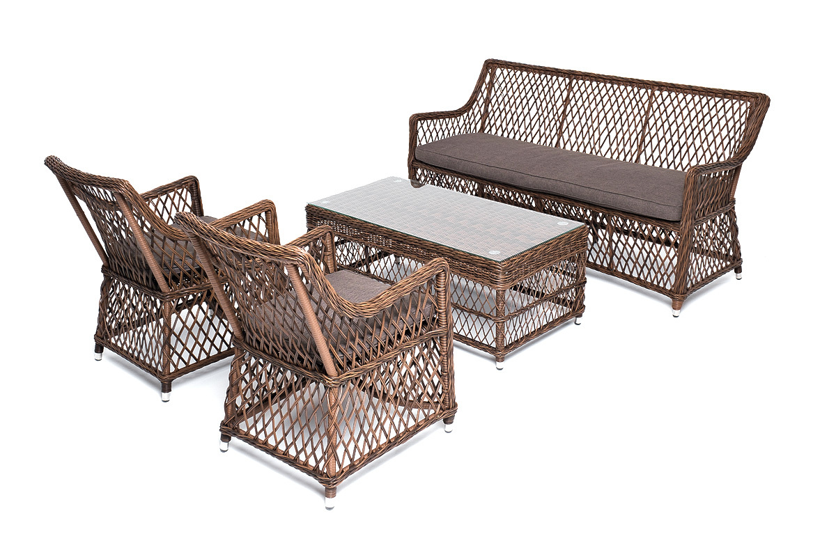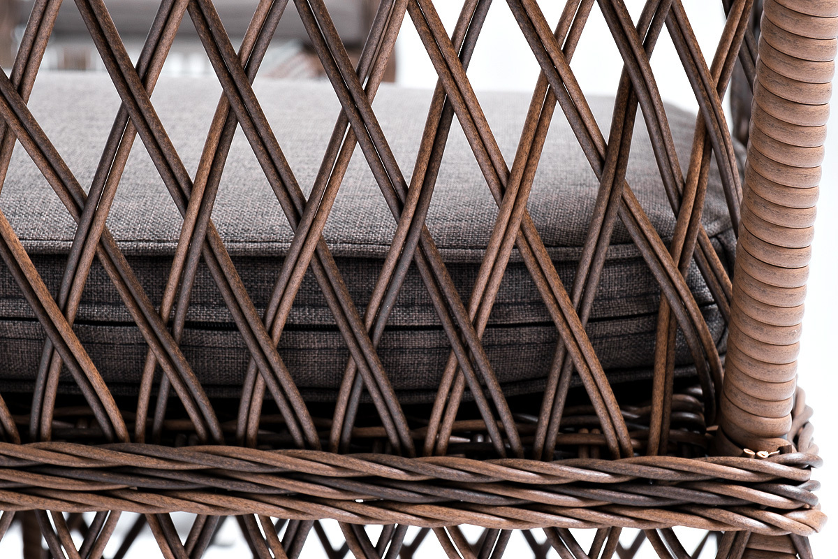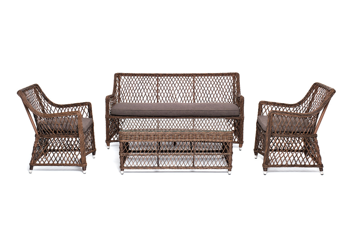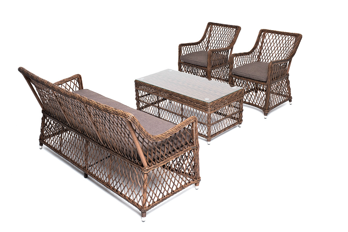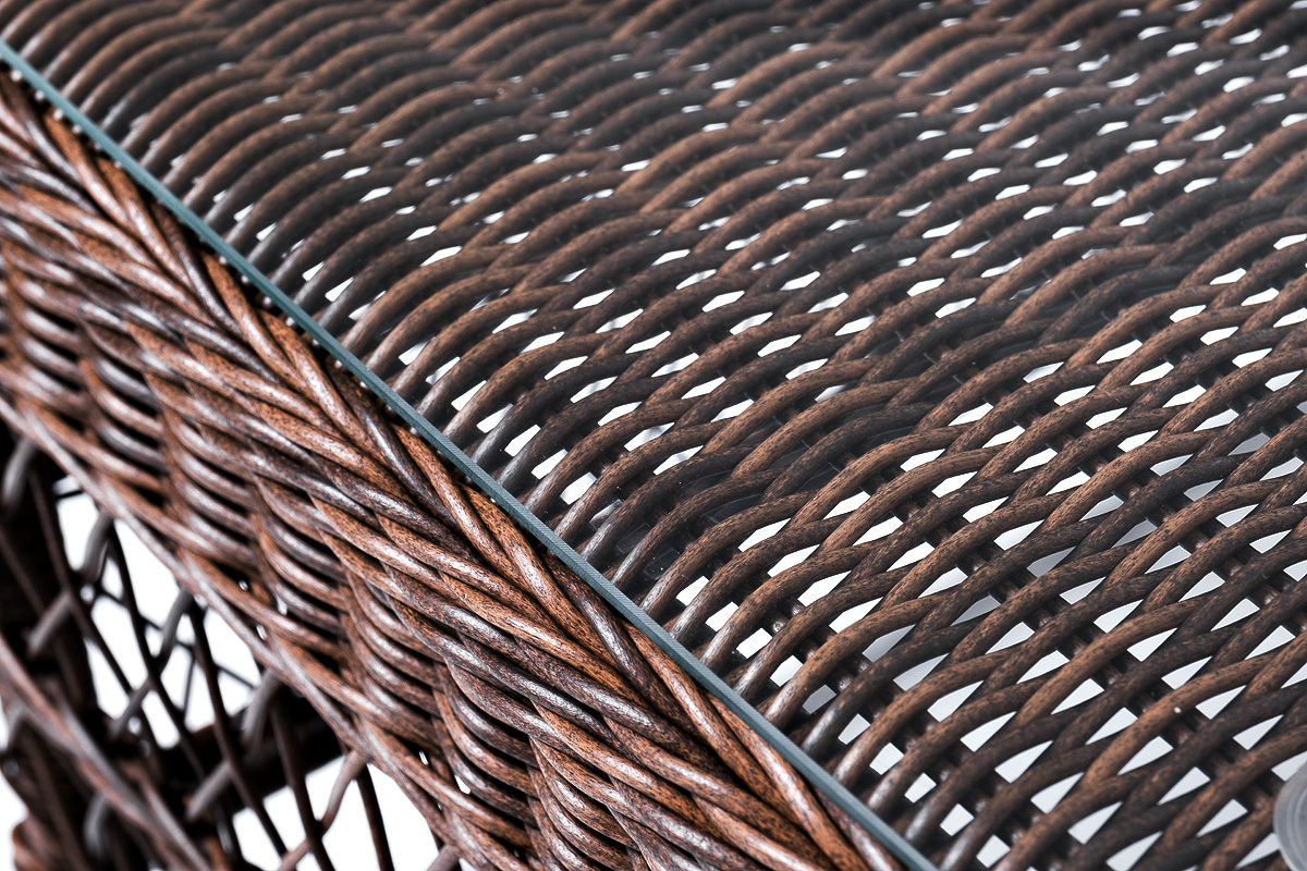 Лаунж-зона «Асти» подходит для размещения четырех персон. За прочность конструкции отвечает каркас из алюминия. В состав входят: – двухместный диван - 1600×660×850 мм. – кресло (2 шт.) - 550×660×850 мм. – журнальный столик - 1120×570×450 мм (толщина стеклянной столешницы в 0,5 см). Оплетка выполнена вручную искусственным ротангом коричневого цвета, диван и кресло укомплектованы подушками из 100% полиэстера, которые пропитаны специальным составом, обладающим влагоотталкивающим свойством. “Латте” диван двухместный из искусственного ротанга, цвет коричневый 1шт. 1 600Х660Х850, “Латте” плетеное кресло из искусственного ротанга, цвет коричневый 2шт. 550Х660Х850, “Гранд Латте” стол журнальный из искусственного ротанга, цвет коричневый 1шт. 1 120Х570Х450,